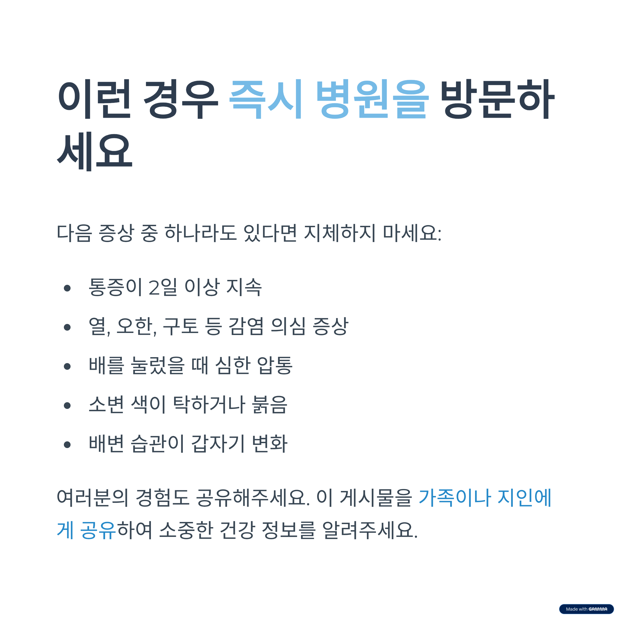 특히 통증이 파도처럼 왔다 갔다 하고, 소변 색이 탁하거나 붉다면 즉시 병원 진료가 필요해요.