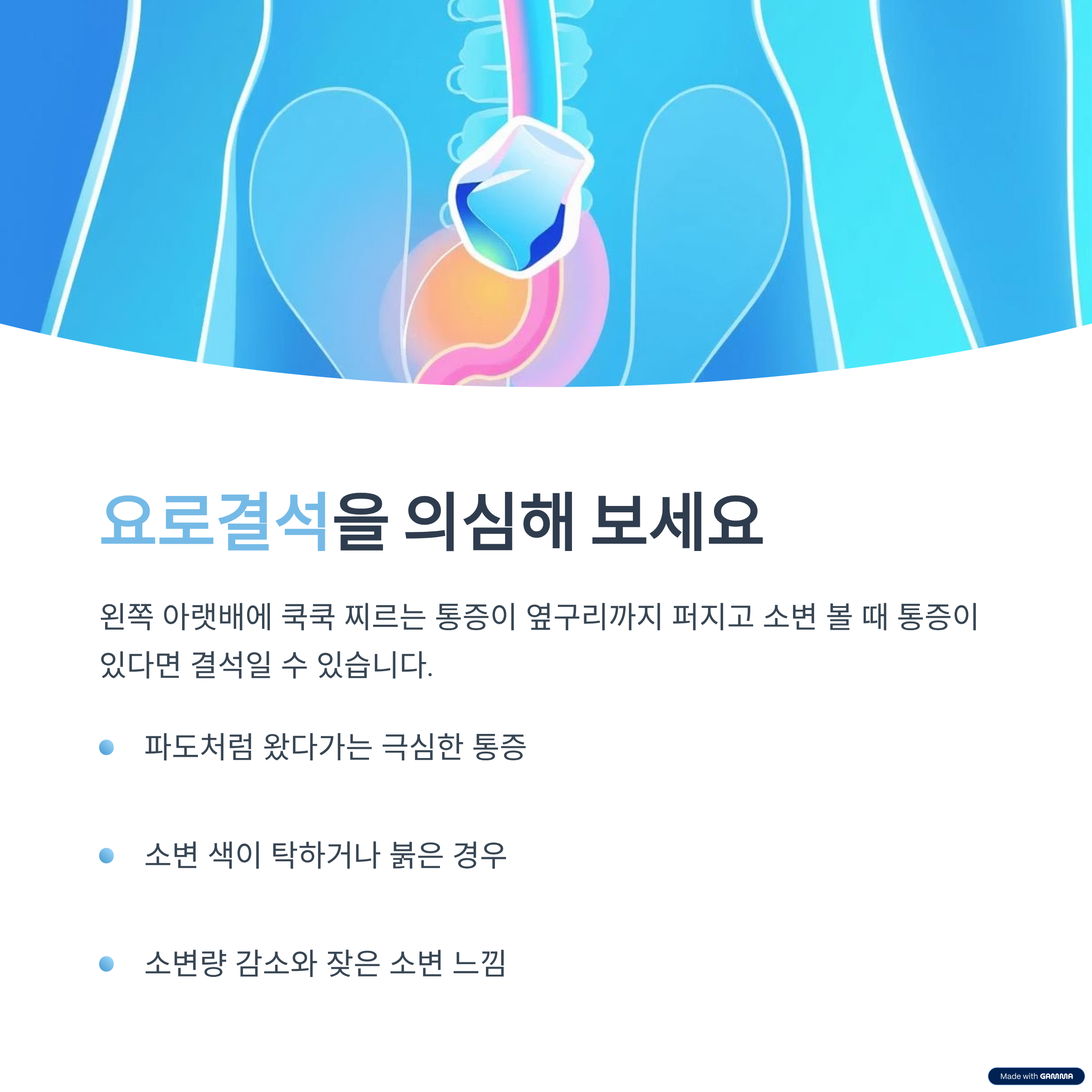 요로결석은 조기 치료 시 간단히 해결되지만, 방치하면 수술까지 가는 경우도 있으니 주의해야 합니다.