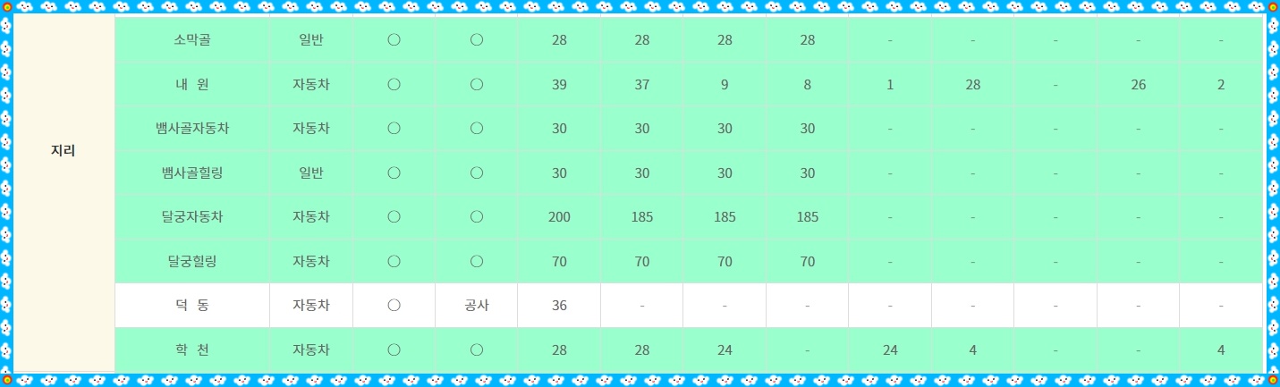 제가 소개하는 국립공원야영장 중 지리산야영장은 8개가 있는데 덕동야영장은 공사로 예약불가하며, 제가 갔었던 달궁자동차야영장은 총200개 인근에 달궁힐링야영장은 70개가 추첨신청 가능합니다.