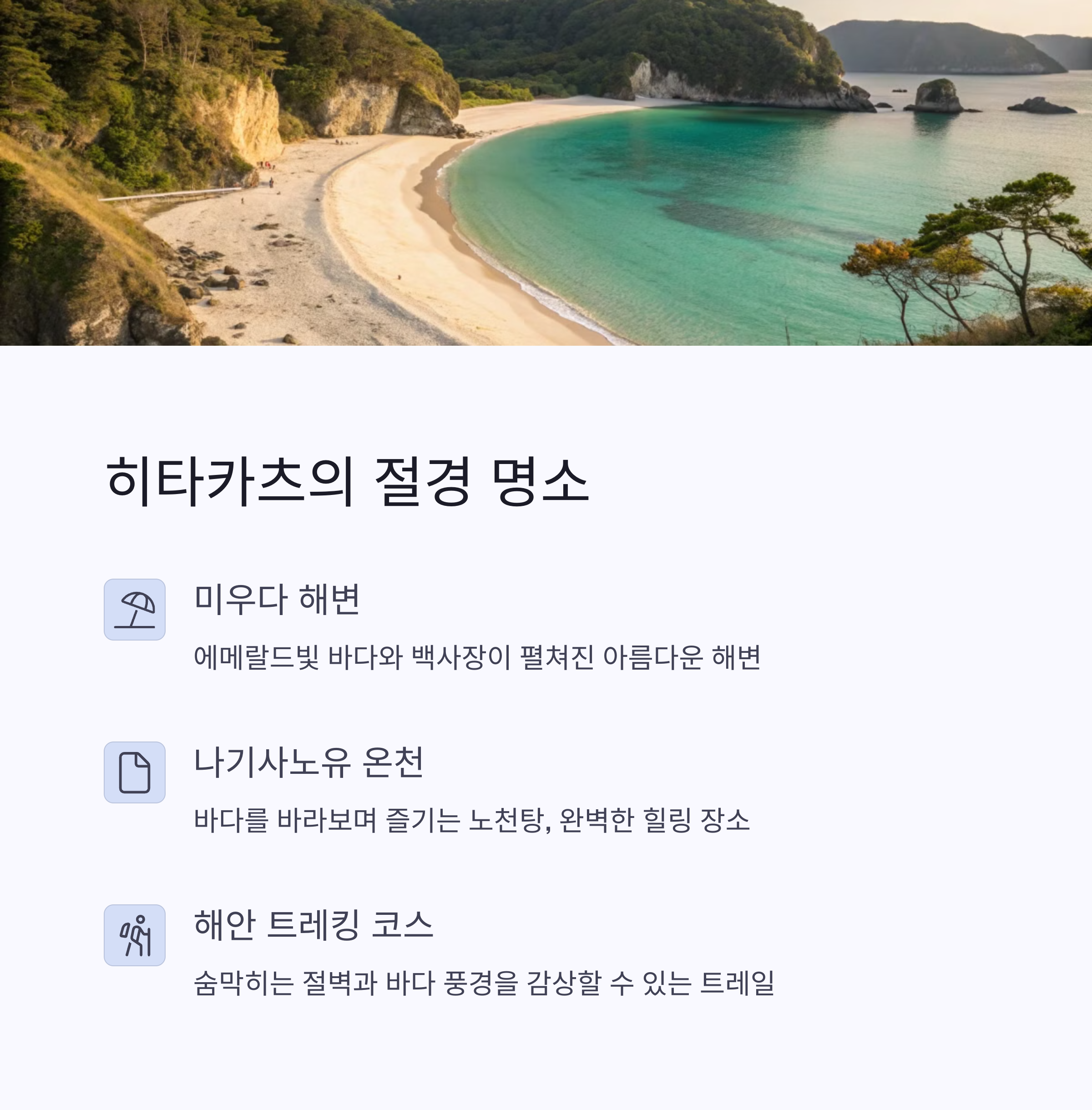 대마도는 한국에서 가장 가까운 일본 섬으로, 짧은 일정에도 충분히 즐길 수 있는 매력적인 여행지입니다. 히타카츠는 자연과 여유로운 분위기를 즐기기에 적합하며, 이즈하라는 문화적 탐방과 쇼핑을 원하는 여행자에게 이상적인 장소입니다.