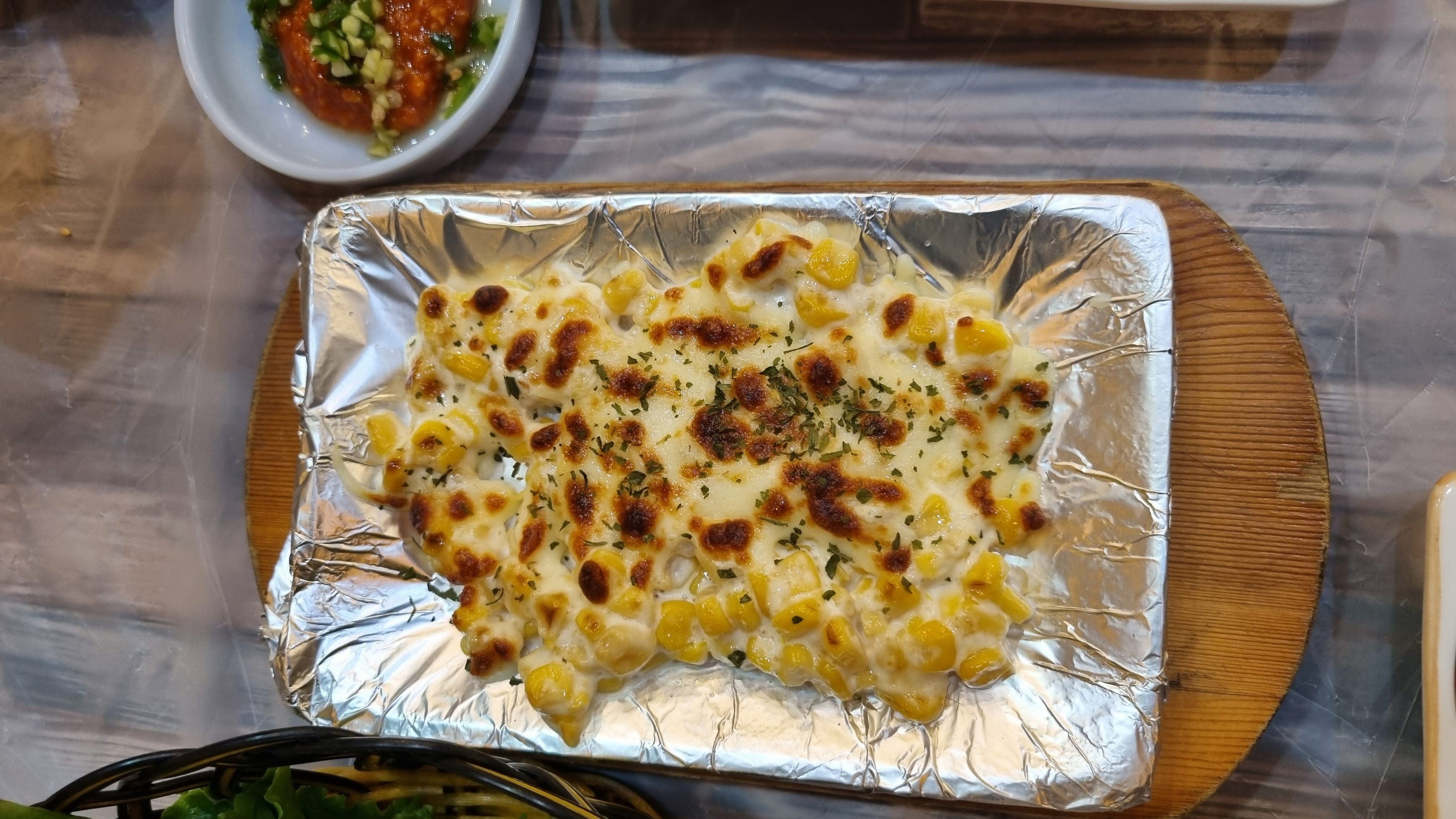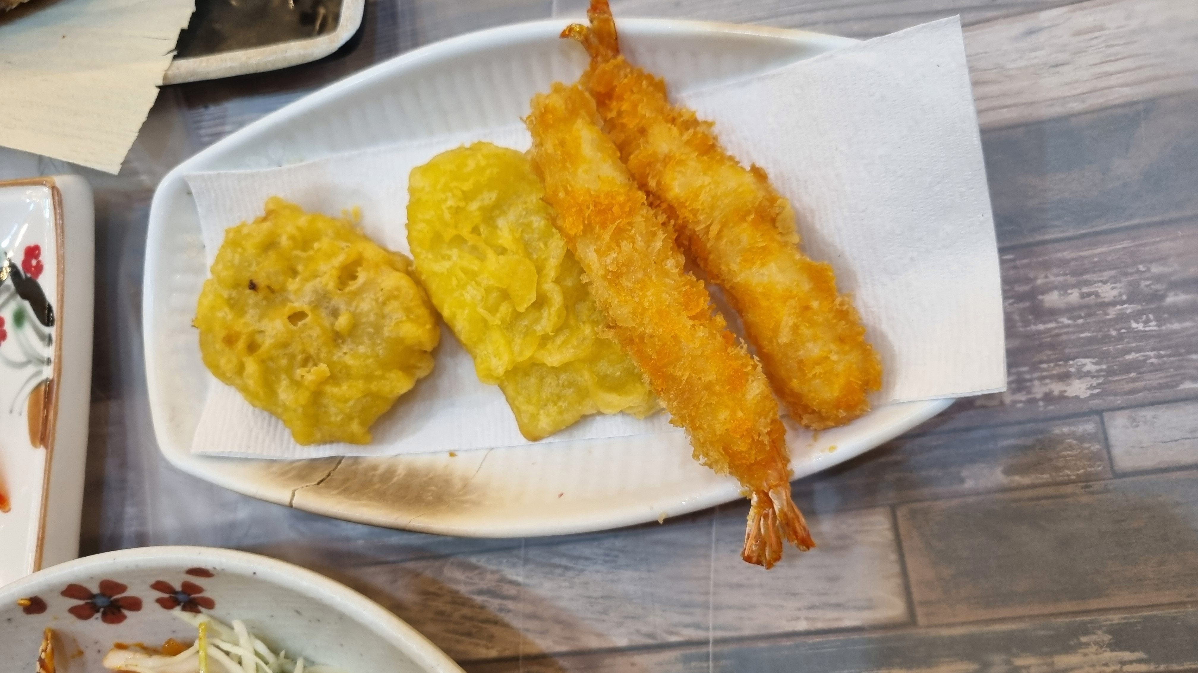 새우튀김. 옥수수콘, 생선구이.