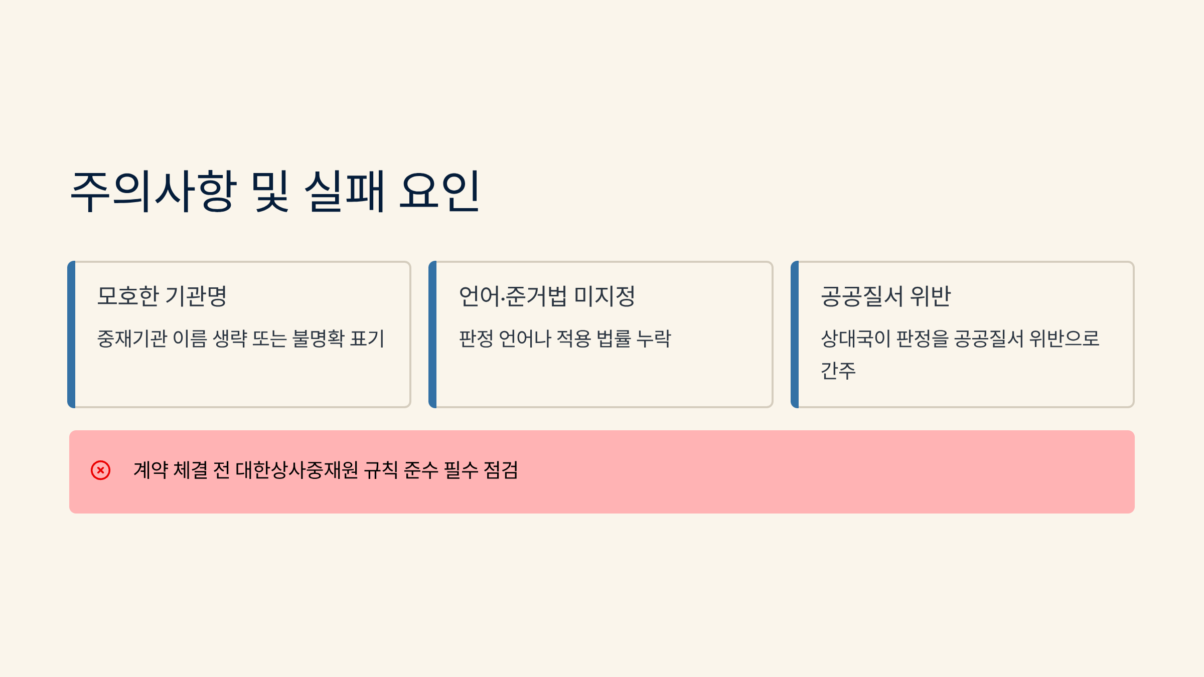 따라서 계약 체결 전 대한상사중재원의 중재 규칙에 따라 조항을 점검하는 것이 필수입니다.