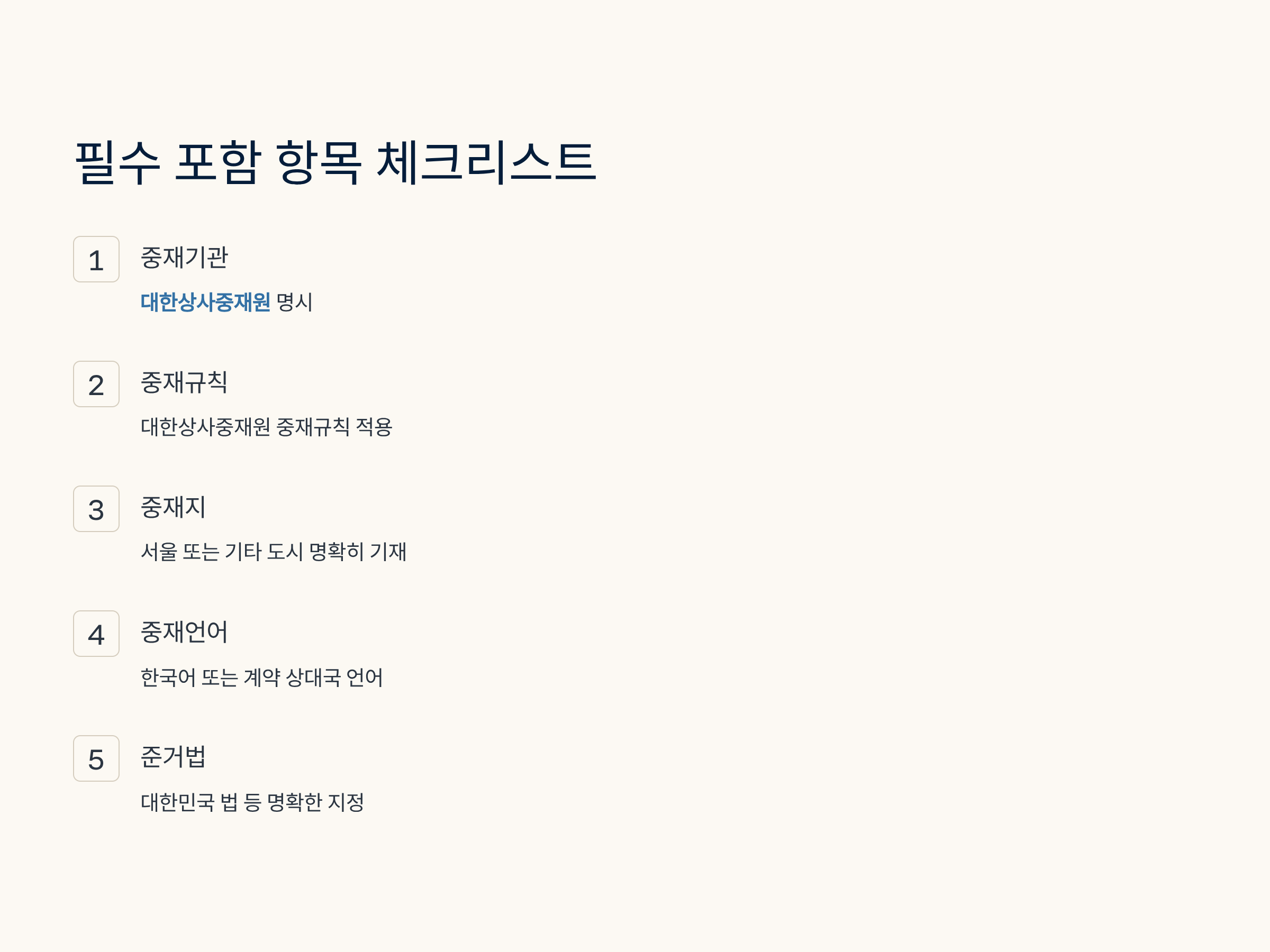 중재조항은 아래 항목들을 포함해야 분쟁 시 실제로 효력을 가집니다.