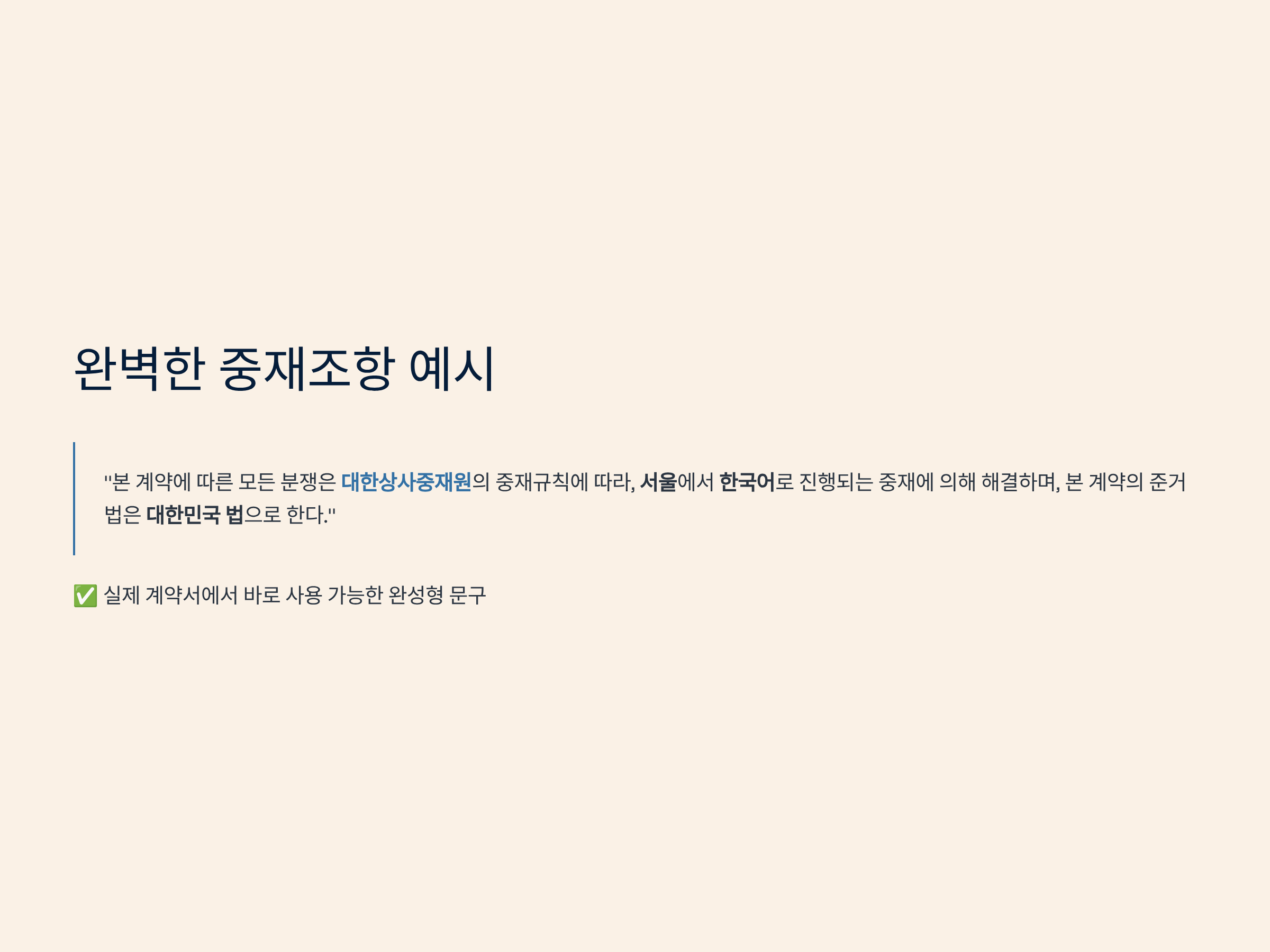 특히 대한상사중재원을 명시할 경우, 국제적으로 인정되는 기관을 통해 강제 집행력 있는 판정을 받을 수 있다는 점에서 기업 간 거래에서는 필수적입니다.