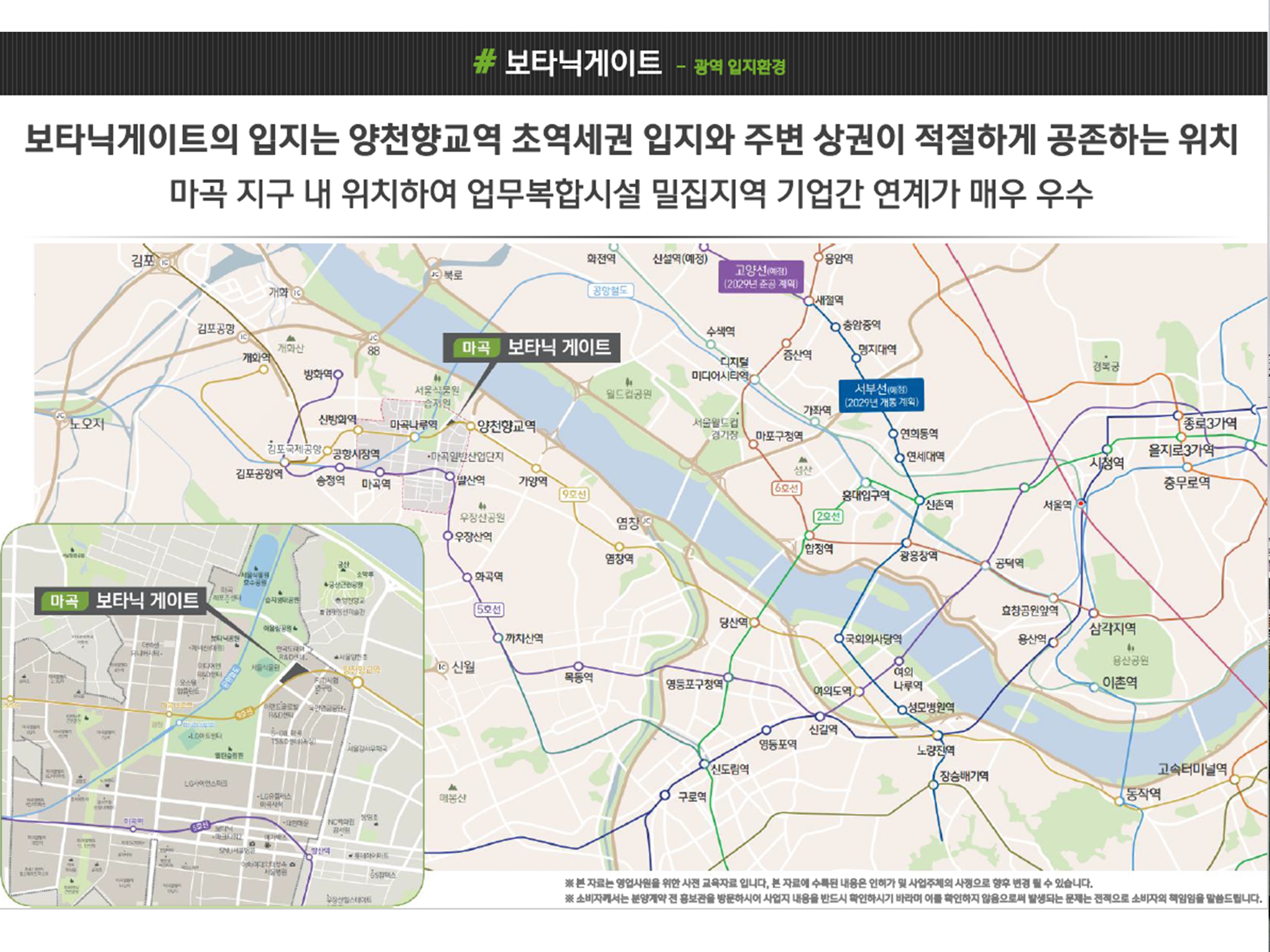 9호선 양천향교역, 5호선 마곡역, 공항철도 마곡나루역을 이용할 수있는 지하철 여건과 올림픽대로 진입 5분이내, 김포공항과 인천공항을 쉽게 이용가능한 비즈니스하기에 너무나 좋은 입지를 가졌다는 점입니다.