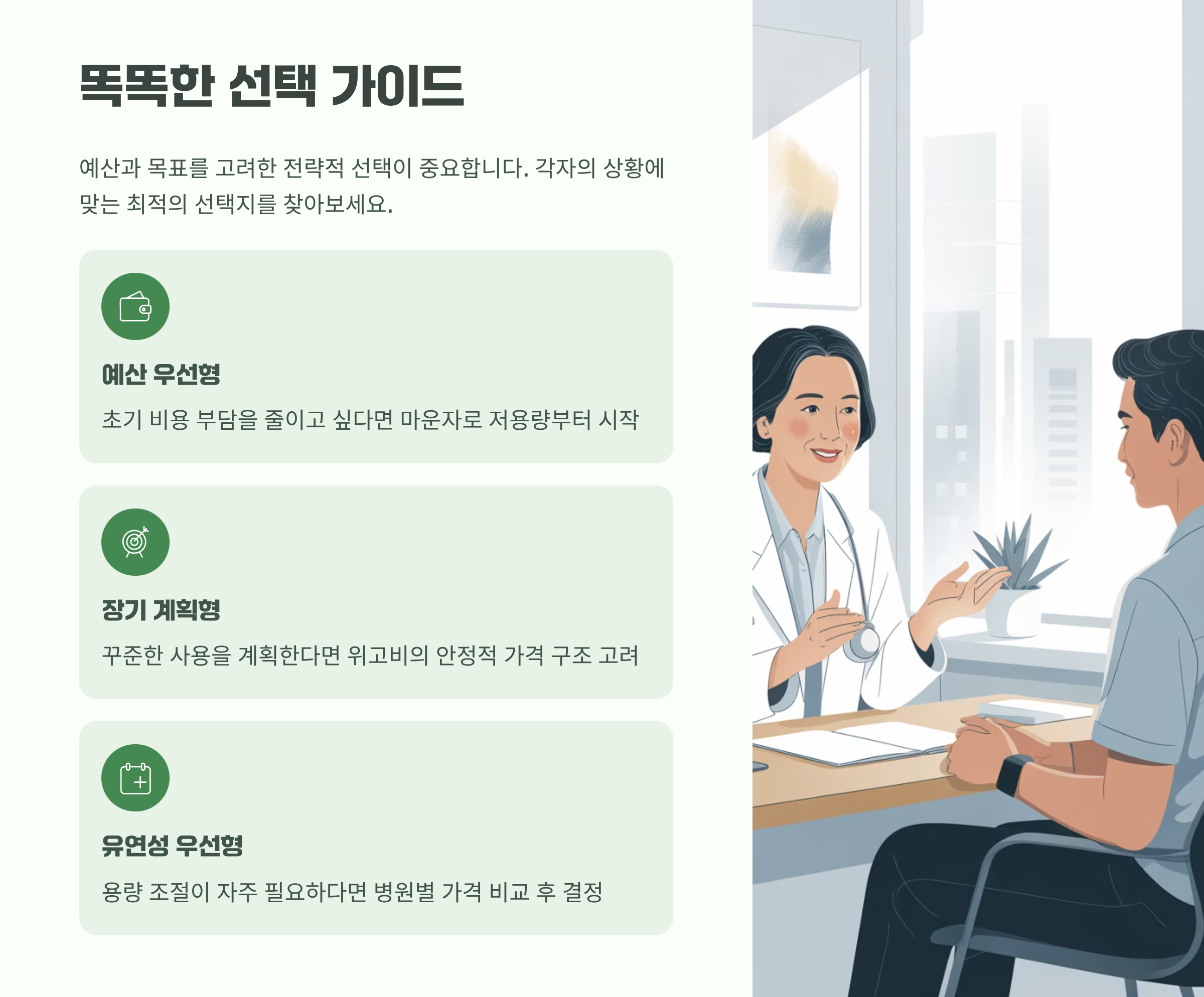 예산, 감량 목표, 주사 빈도, 용량별 반응 등을 종합적으로 고려해야 합니다. 마운자로는 초기 비용이 낮아 시작 부담이 덜하지만, 장기 사용 시 유지 비용이 더 높아질 수 있어요. 반면 위고비는 가격 인하로 시작은 더 비싸지만, 장기 비용이 상대적으로 안정적일 수 있습니다. 다이어트도 결국 전략입니다. 여러분은 어떤 기준으로 선택하시겠어요?