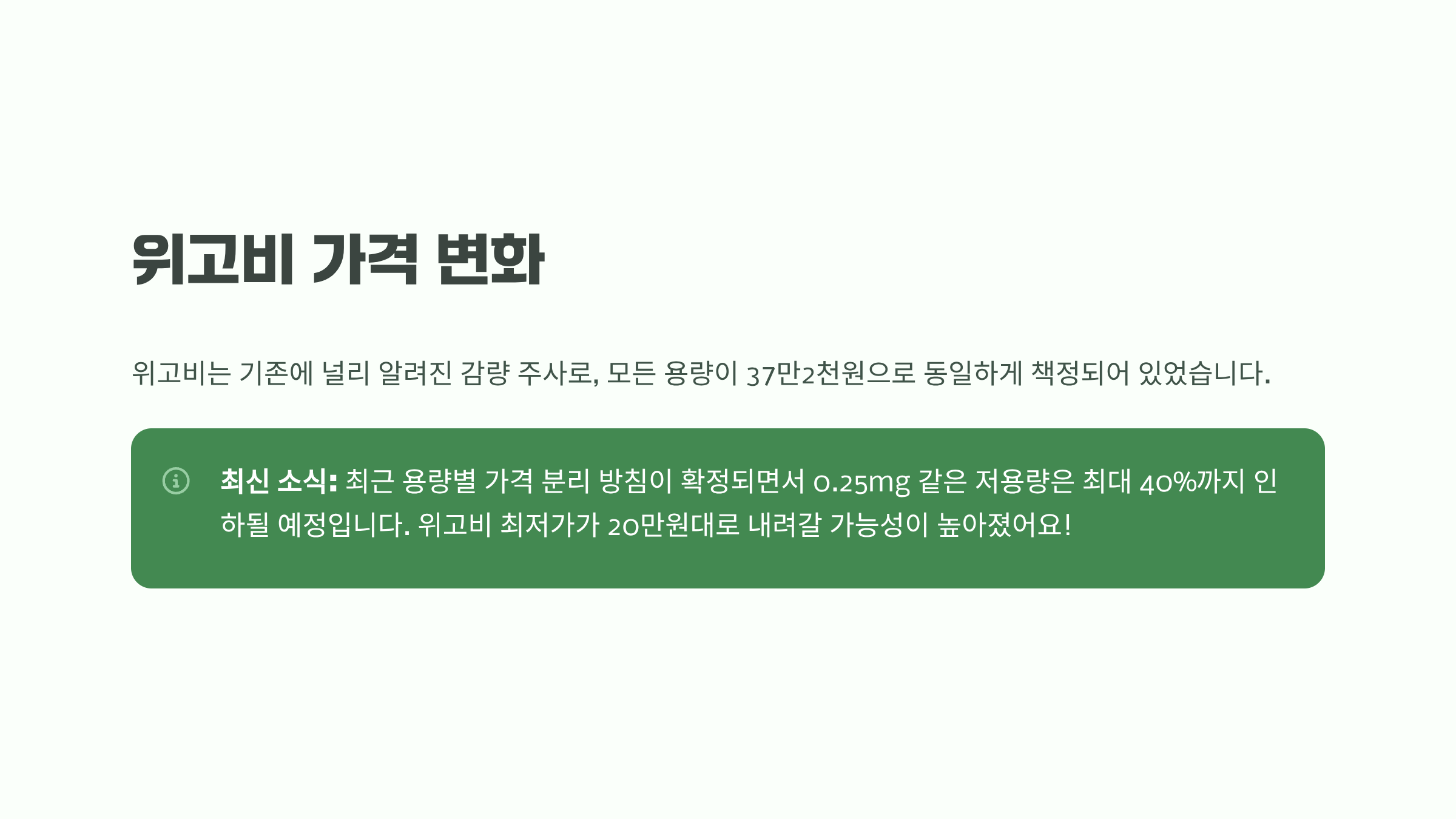 위고비는 기존에 널리 알려진 다이어트 주사죠. 국내 판매가는 모든 용량 구간에서 37만2000원으로 동일하게 책정되어 있었지만, 최근 용량별 가격 분리 방침이 확정되면서 0.25mg 같은 저용량은 최대 40%까지 인하될 예정이라고 합니다. 이렇게 되면 위고비 최저가는 20만 원대로 내려갈 가능성이 있어요.