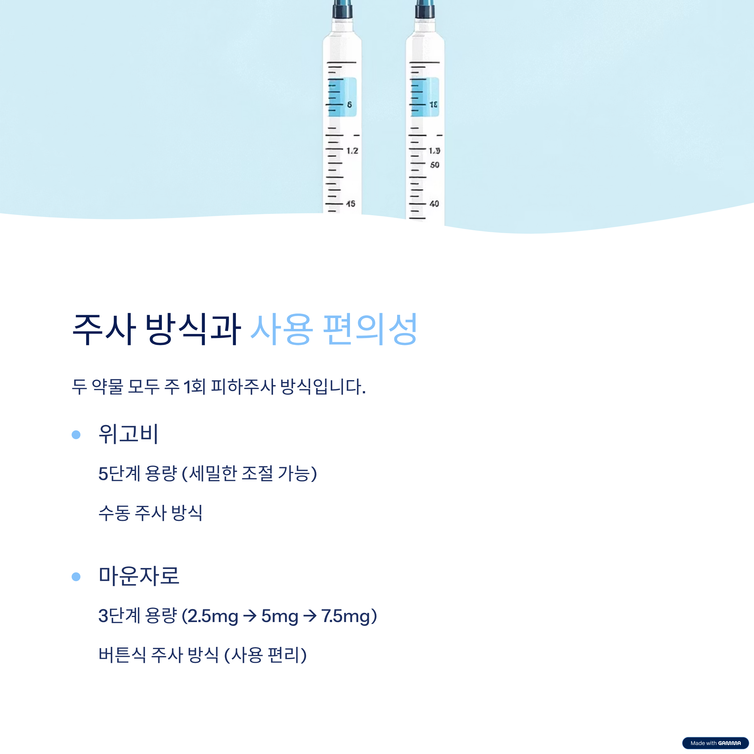 두 약물 모두 주 1회 피하주사 방식입니다. 위고비는 용량별로 5단계가 있어 점진적 증량이 가능한 반면, 마운자로는 용량 구간이 2.5mg → 5mg → 7.5mg 이상으로 상대적으로 간단합니다.