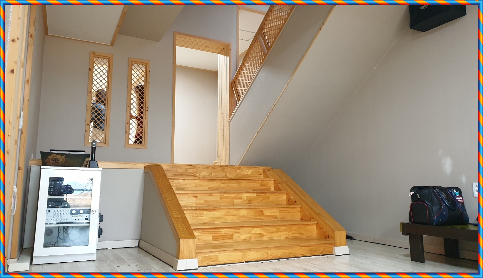 1층 거실공간만으로도 10명도 잘 수있는 충분한 공간이지만 당연히 인원제한이 있기 때문에 거실공간은 주로 식사와 음주가무공간으로 활용하고 남.녀가 분리해서 또는 가족간 분리해서 잠을 자야한다면 사진처럼 1층을 올라 주방이 있고 2층을 오르는 계단아래에 방이 있어요.