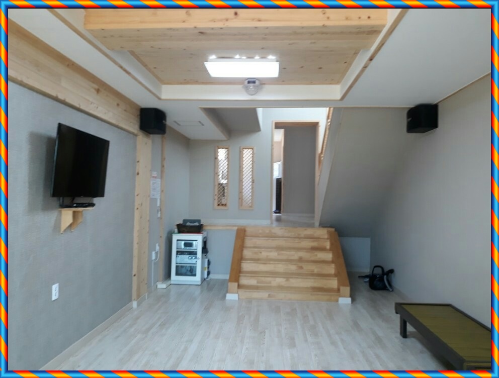 밖에서는 2층이지만 내부에서는 3층과 비슷한 형태로 되어있는데요, 사진과 같이 계단을 오르면 주방시설, 그리고 다시 계단을 오르면 2층 침대방이죠. 거실공간에는 노래방이 설치되어 있어 밤새 즐거운 시간을 가져도 아무런 제약이 없는 독채 목포팬션이랍니다.