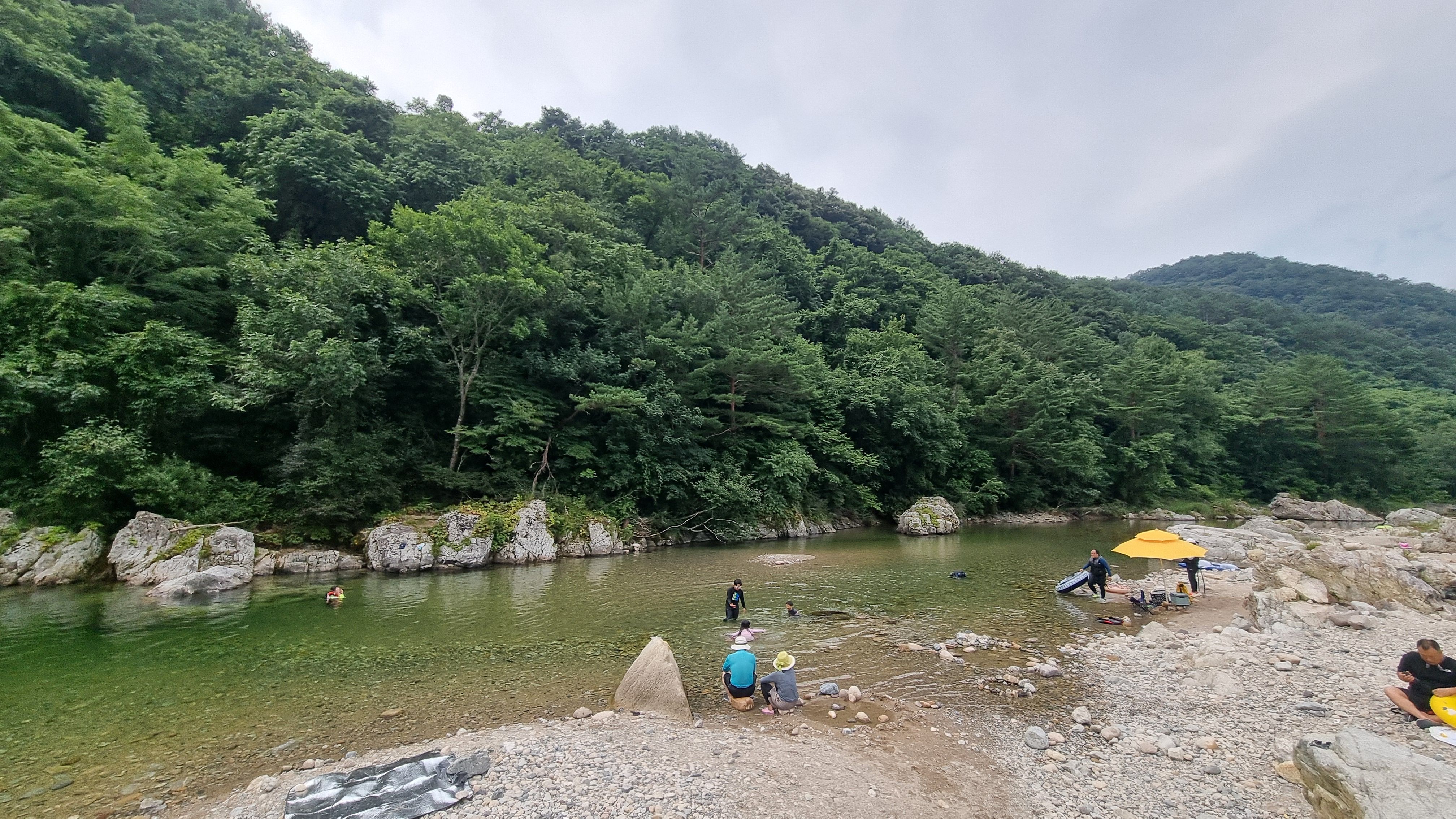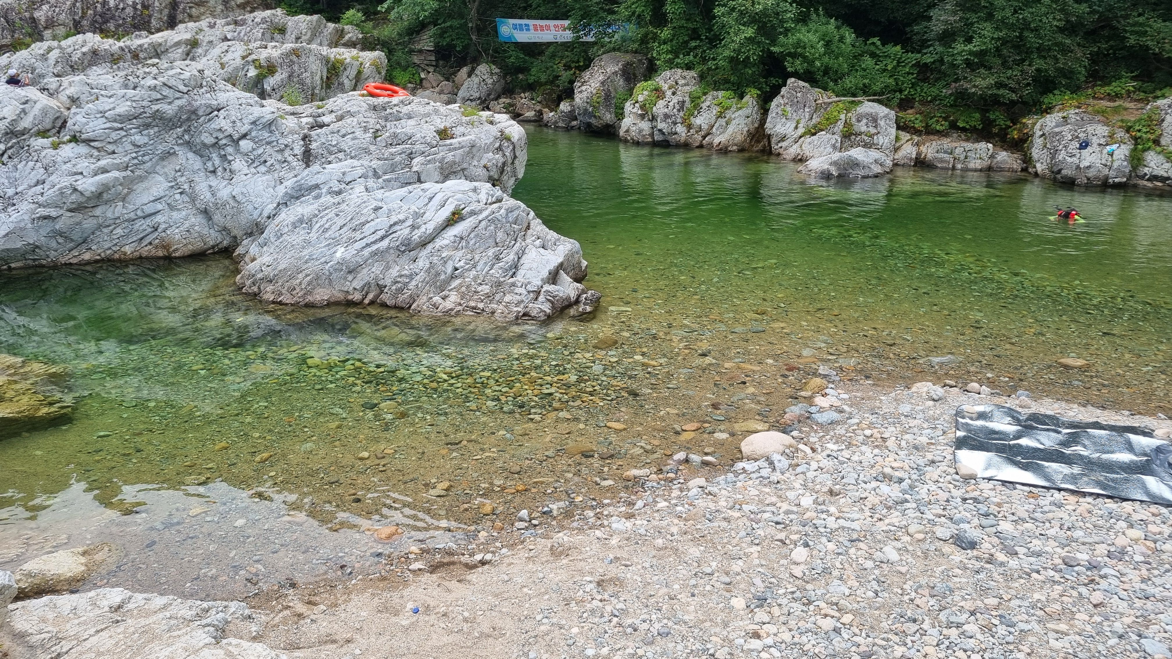 계곡 양쪽은 숲이 울창해서 햇빛을 가려주고, 곳곳에 평평한 자갈 구간이 많아 텐트나 매트 깔기도 좋았습니다. 특히 낮은 수심대와 깊은 다이빙 구역이 구분돼 있어 놀이터처럼 다양한 즐길 거리가 펼쳐지는 느낌이었어요.