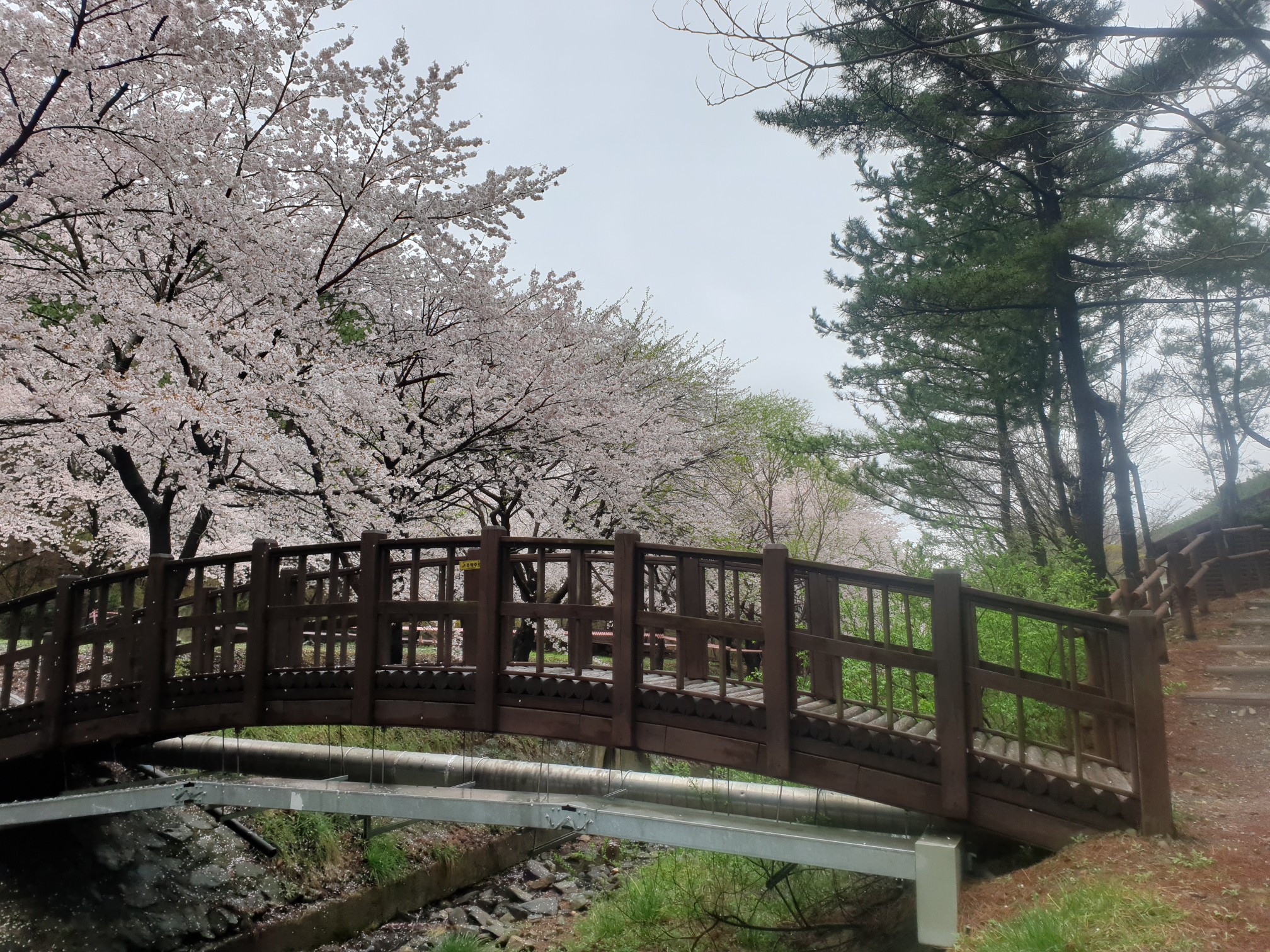 계곡옆에 줄줄이 늘어난 벚꽃나무 사이에 데크가 자리하고 있어서 맑은날도 좋고 비가오면 더 환상적인 풍경을 안겨주는 휴양림 이죠.