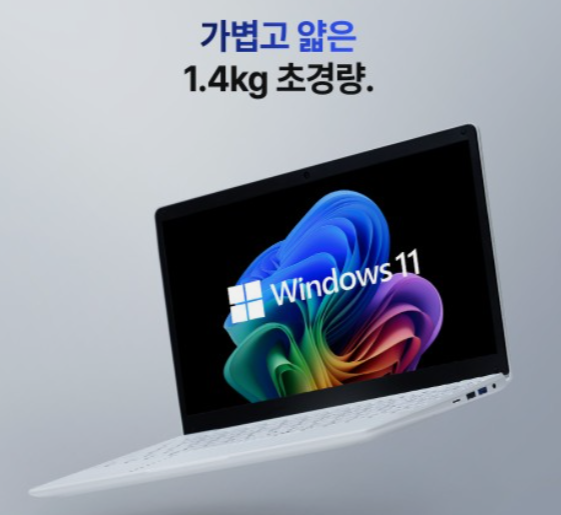 외형은 단순하지만 세련된 화이트 컬러와 슬림한 라인으로 어디에나 잘 어울립니다. 무게는 약 1.4kg으로 매우 가볍고, 14.1인치 화면은 가방에 쏙 들어가는 컴팩트한 사이즈입니다.