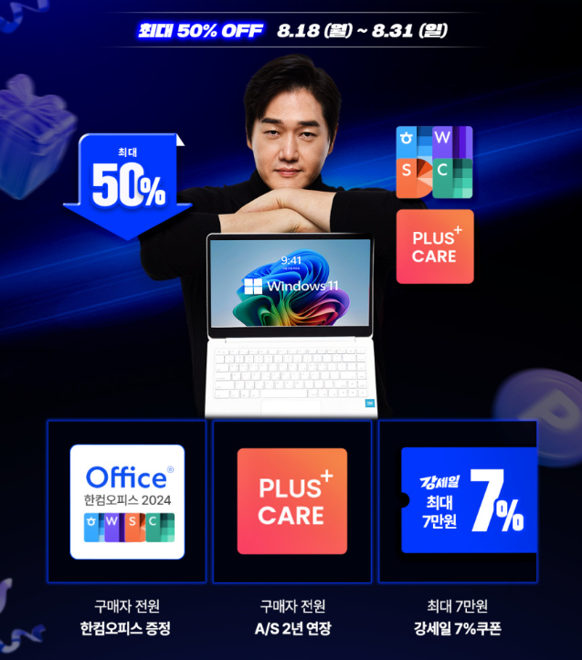 게다가 한컴오피스 2024 정품 제공, 2년 무상 A/S, Plus+Care 보증 프로그램까지 포함되어 실질적인 가치는 훨씬 큽니다.
