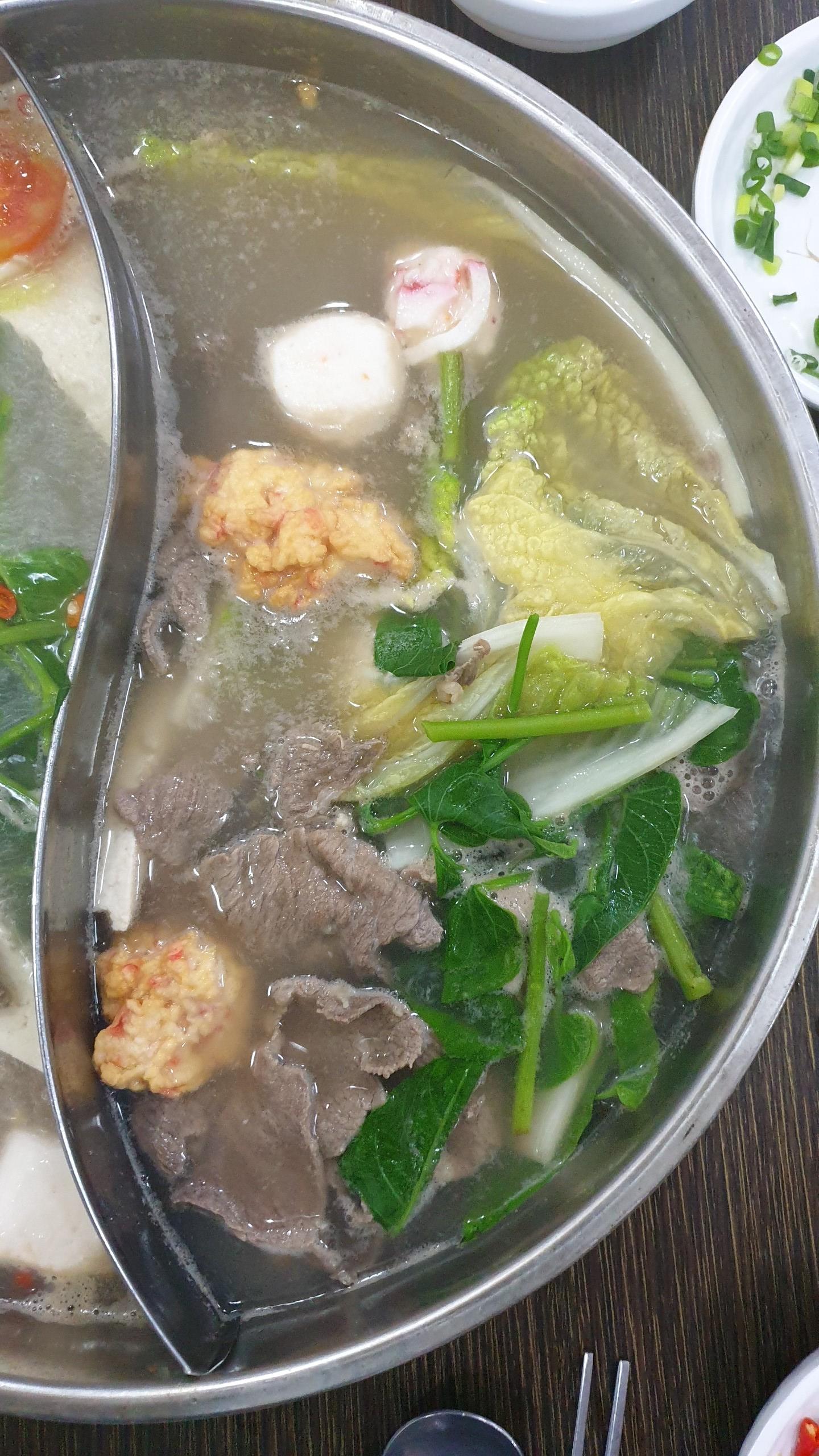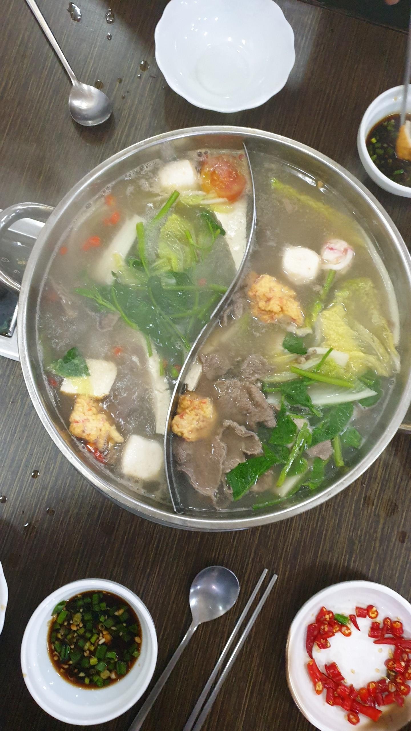 우리메뉴는 샤브샤브 였는데 용기는 훠궈냄비 처럼 생겼네요. 빨갛진 않지만 한쪽은 고추등을 넣어 얼큰하게 한쪽은 담백하게 먹을수있는 국물이죠