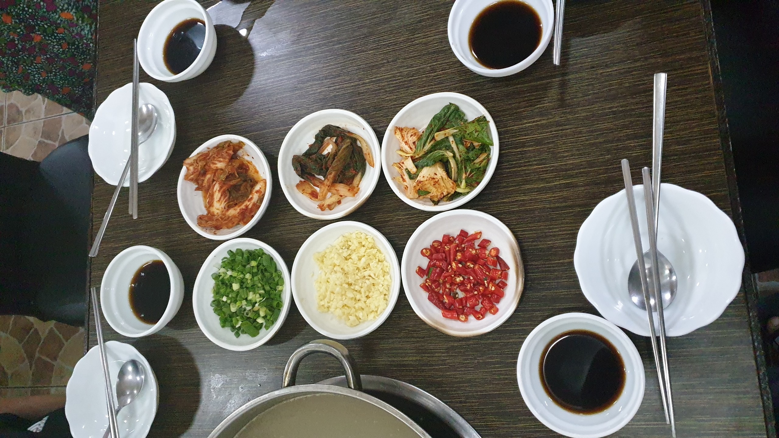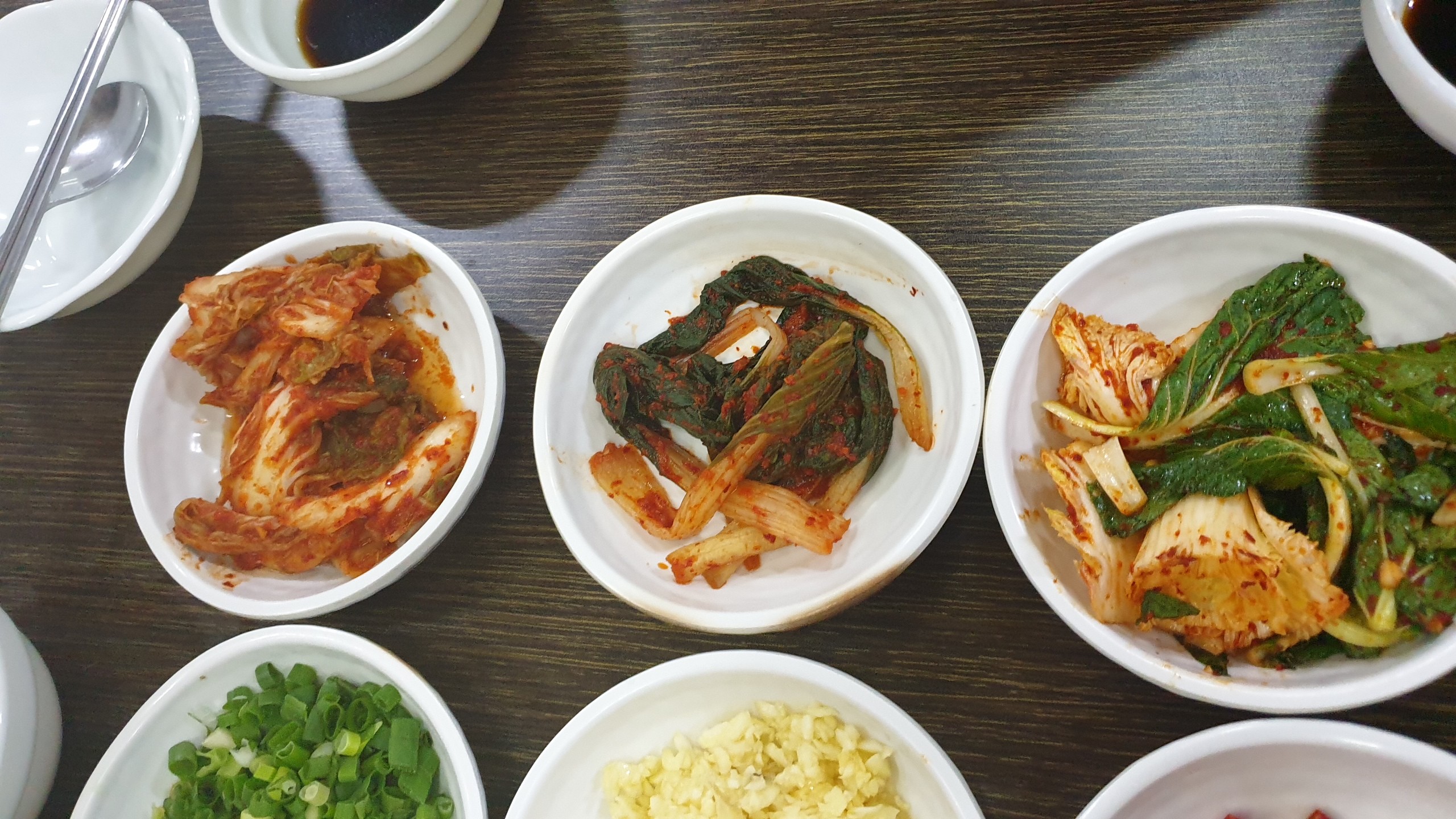 기본반찬인데요 김치맛이 일품이에요.마늘과 빨간고추 쪽파등이 나오네요.