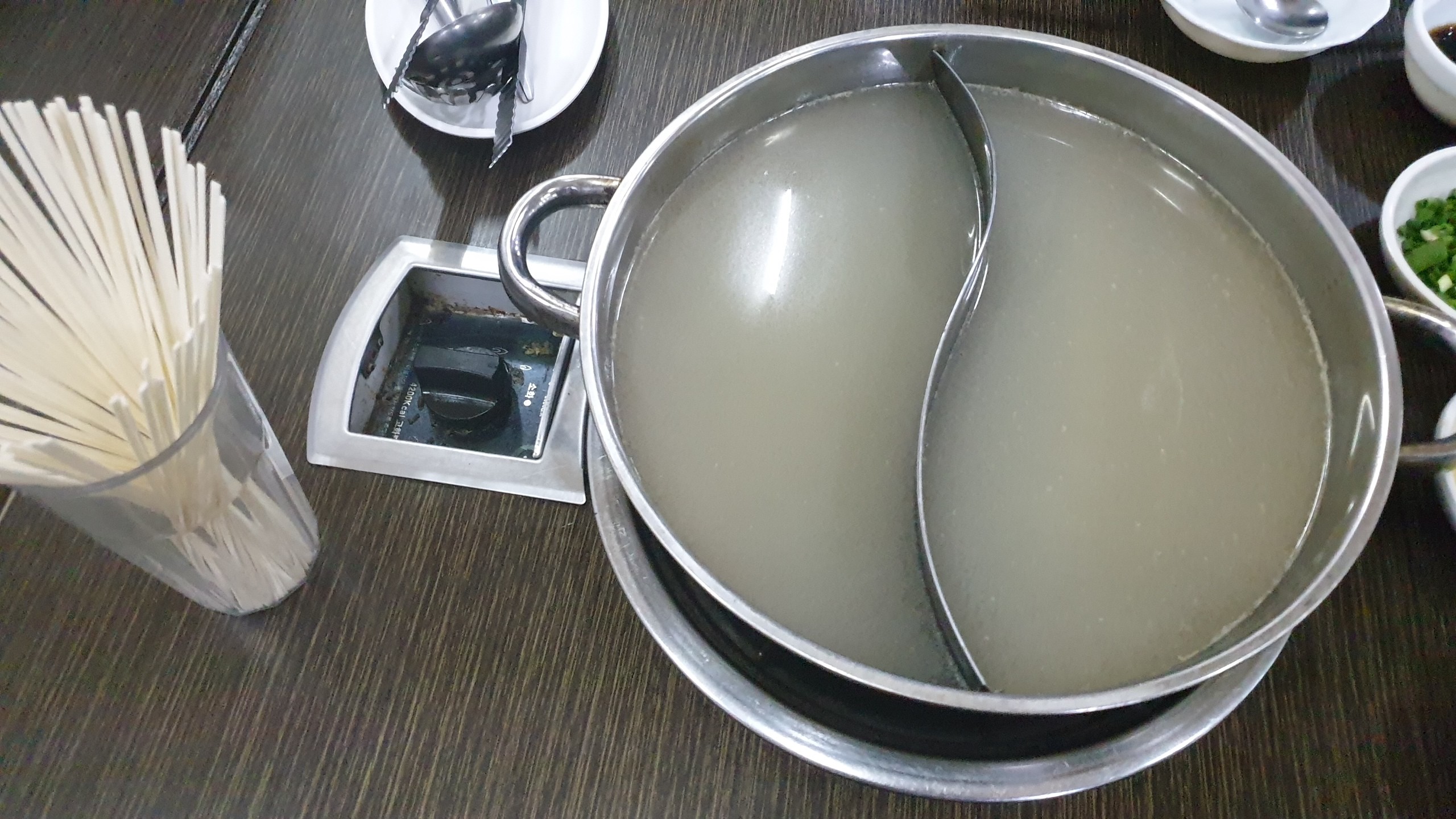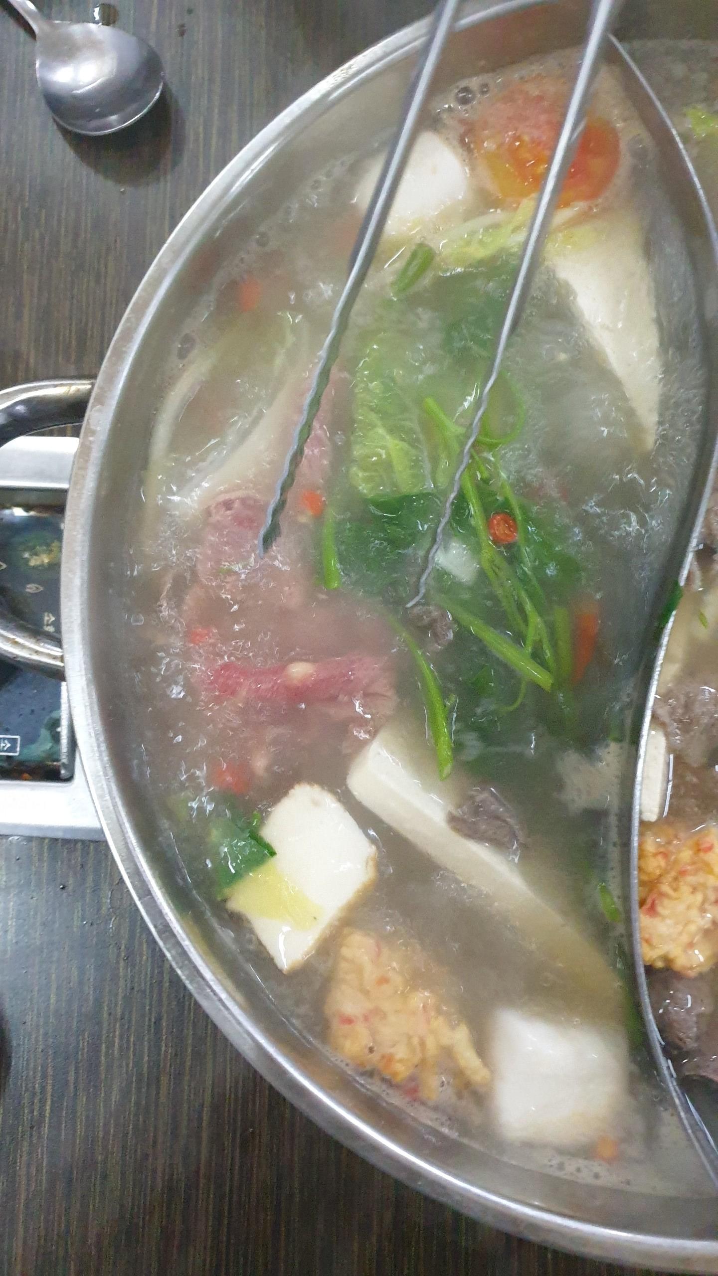 우리메뉴는 샤브샤브 였는데 용기는 훠궈냄비 처럼 생겼네요. 빨갛진 않지만 한쪽은 고추등을 넣어 얼큰하게 한쪽은 담백하게 먹을수있는 국물이죠