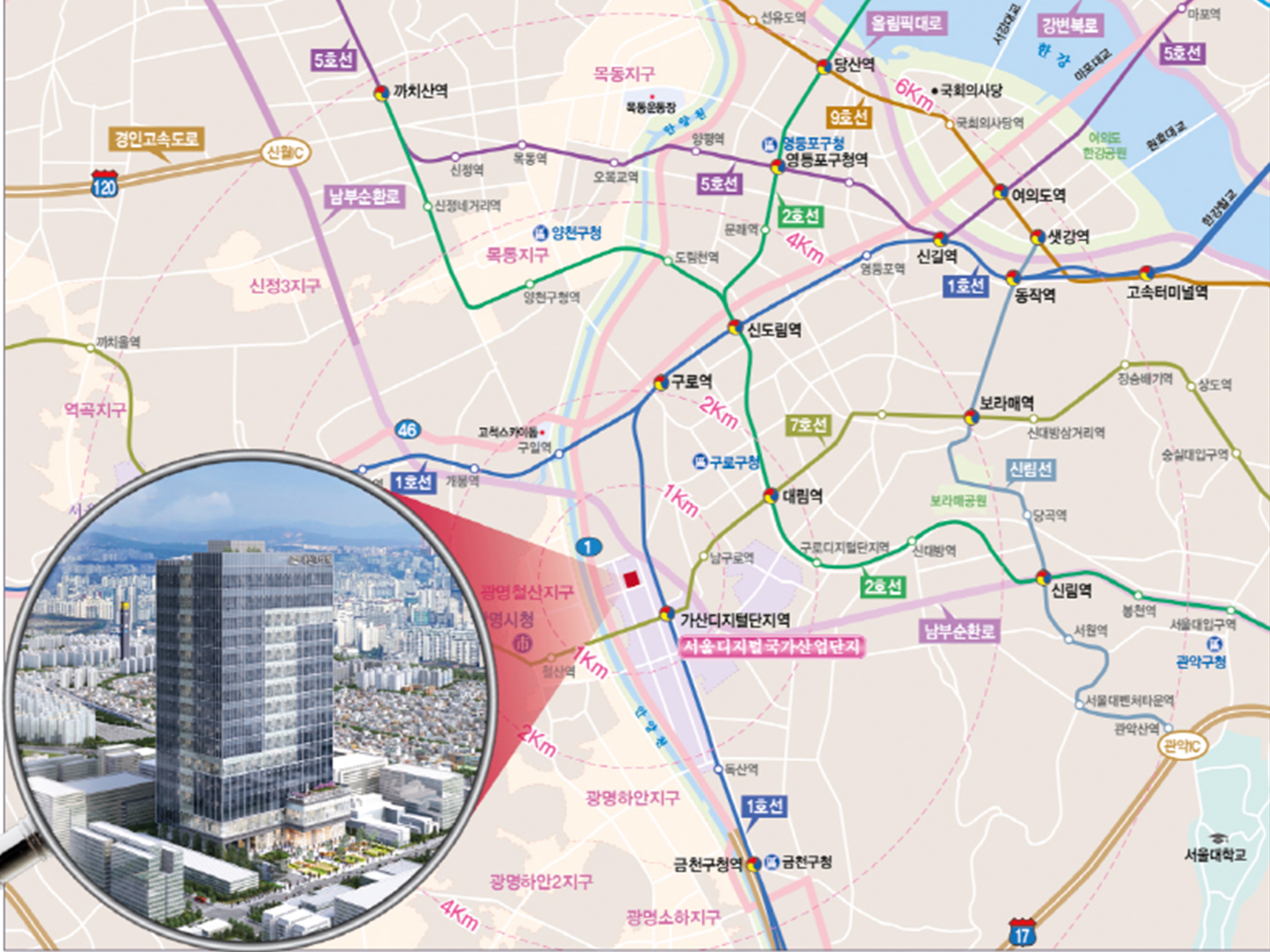 또한 서부간선도로 지하화로 교통흐름이 크게 개선되었고 진출입 램프가 차량으로 3분이면 이용이 가능하기 때문에 지방및 시내로 이동도 아주 편리하여 물류이동이 잦은 기업들도 선호할 만한 입지 입니다.