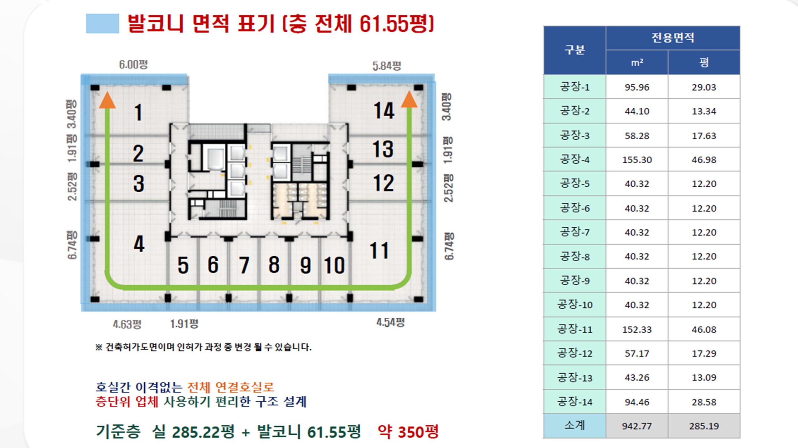 대신it타워 가산지식산업센터 는 입지만큼 장점도 돋보이는 현장인데요, 기준층 층고를 4.2m(일반적으로 3.6~3.8m) 설계하여 개방감이 뛰어나면 모든호실이 발코니를 서비스면적으로 제공하여 1개층 사용시 무려 62평의 서비스면적을 가져가게 됩니다.