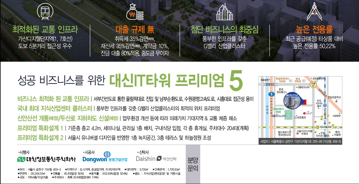 이런 가운데 가산디지털단지 6번출구에서 걸어서 5분이면 도착 가능한 역세권입지의 대신it타워가 사업설명회와 함께 곧 청약절차에 착수한다는 소식입니다.