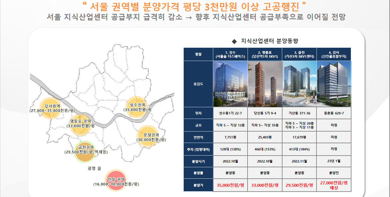 무엇보다 올해부터 서울 및 가산 지식산업센터 공급이 크게 감소하면서 현재 서울 주요업무지구의 임대난을 겪고 있는 상황에서 2025년이후 공급되는 물량이 거의 없기 때문에 해당 시기 준공예정인 건물들은 큰 시세상승과 인기가 기대되는 상황입니다.