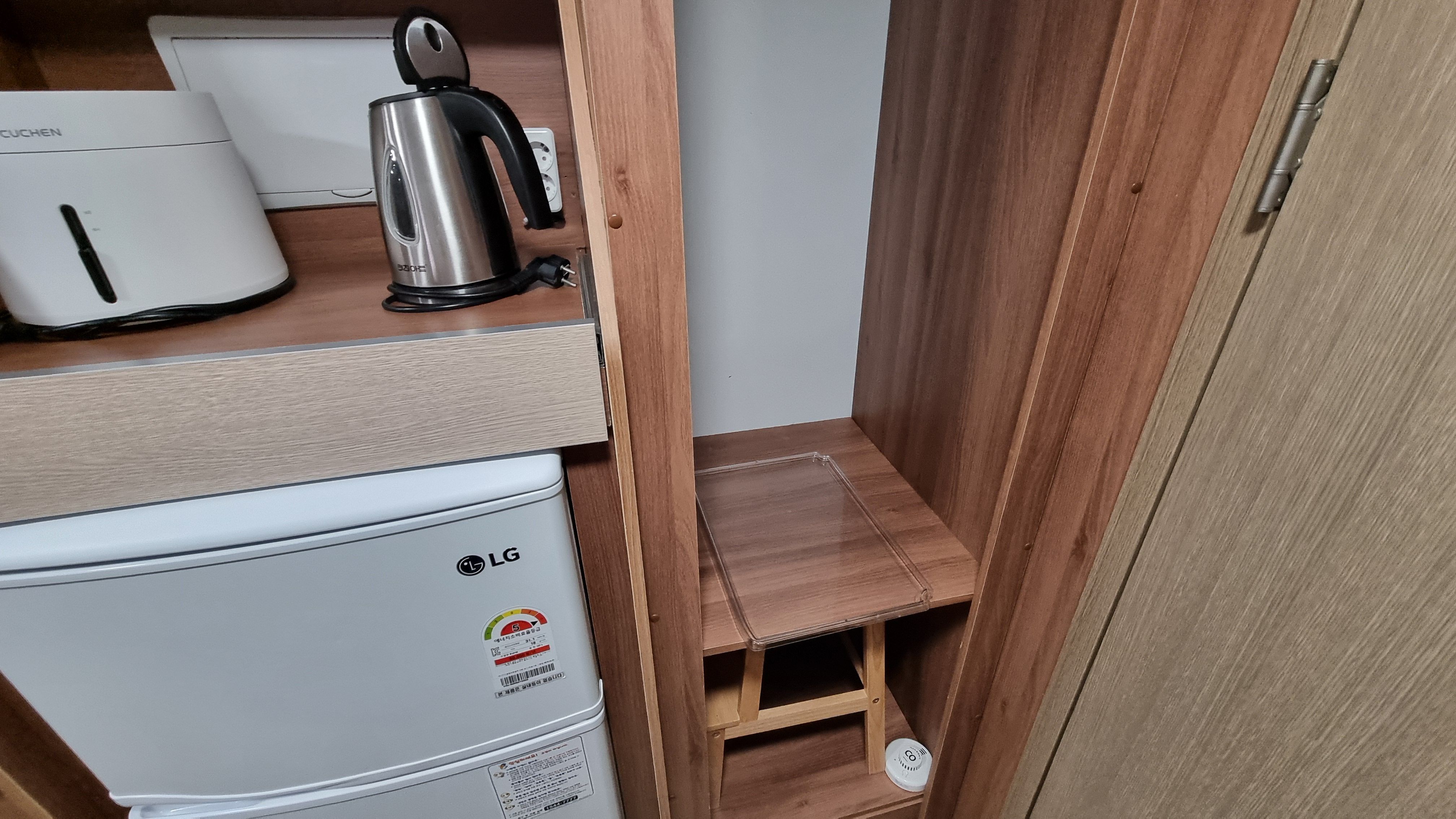 소형 냉장고는 2~3일치 식재료 보관에 충분했고, 옷장·상부 선반·신발장 등 수납공간도 잘 배치돼 있습니다.