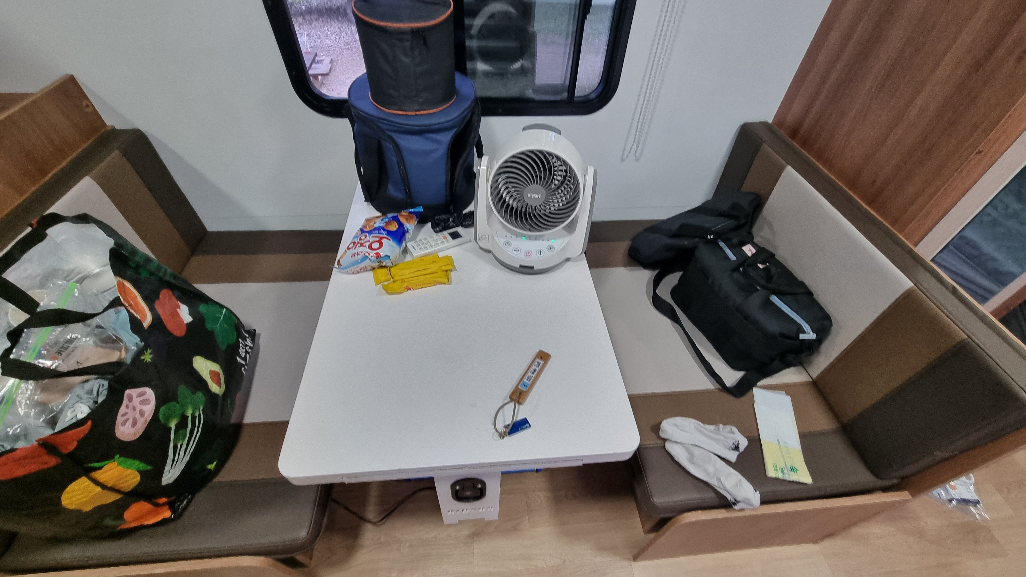 중간에는 내부 4인용 테이블이 있는데 많은 시간을 이곳에서 보냈답니다. 이 테이블은 펼치면 침대가 되기 때문에 사실상 6명이 사용해도 되는 카라반 입니다.