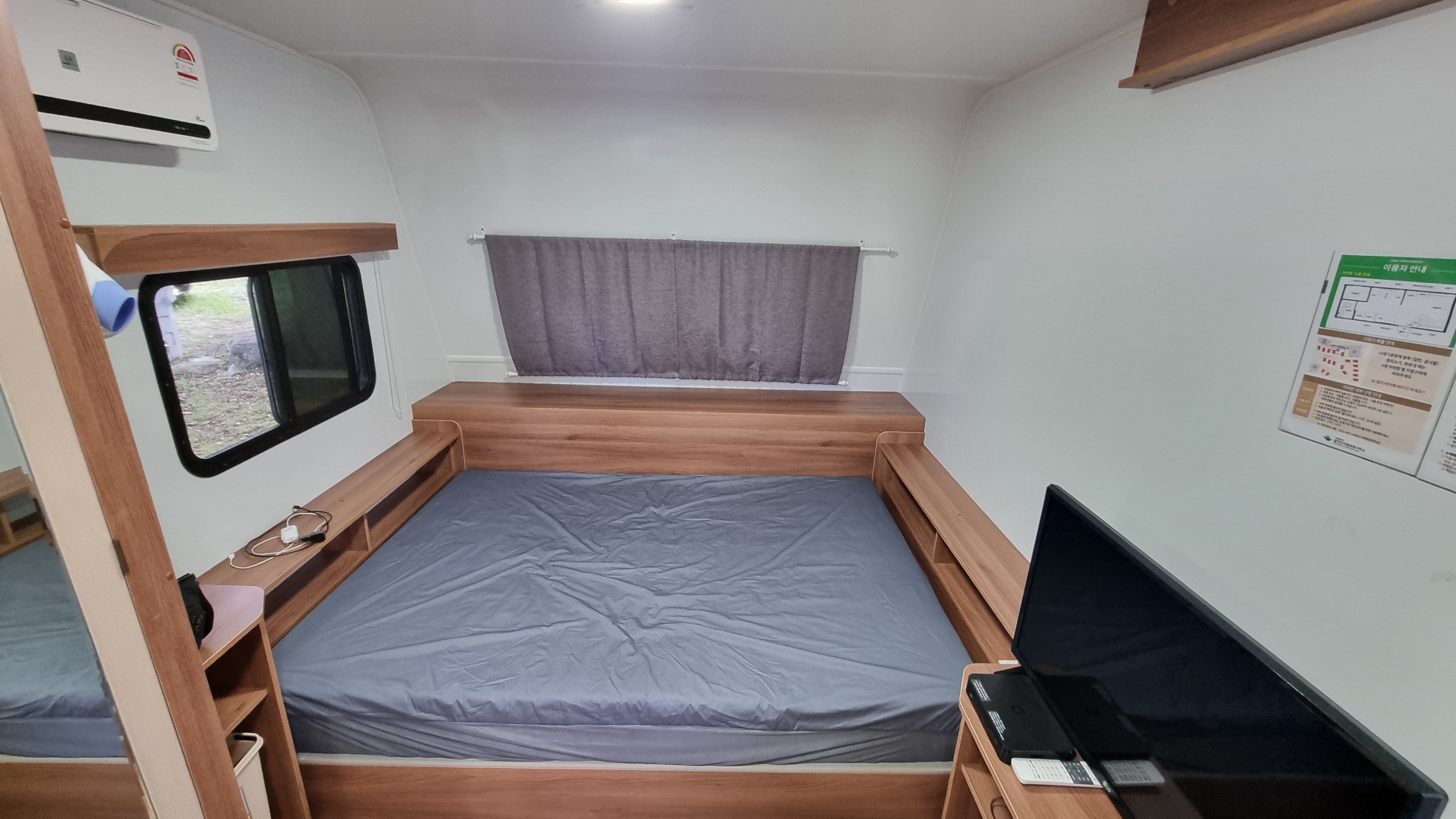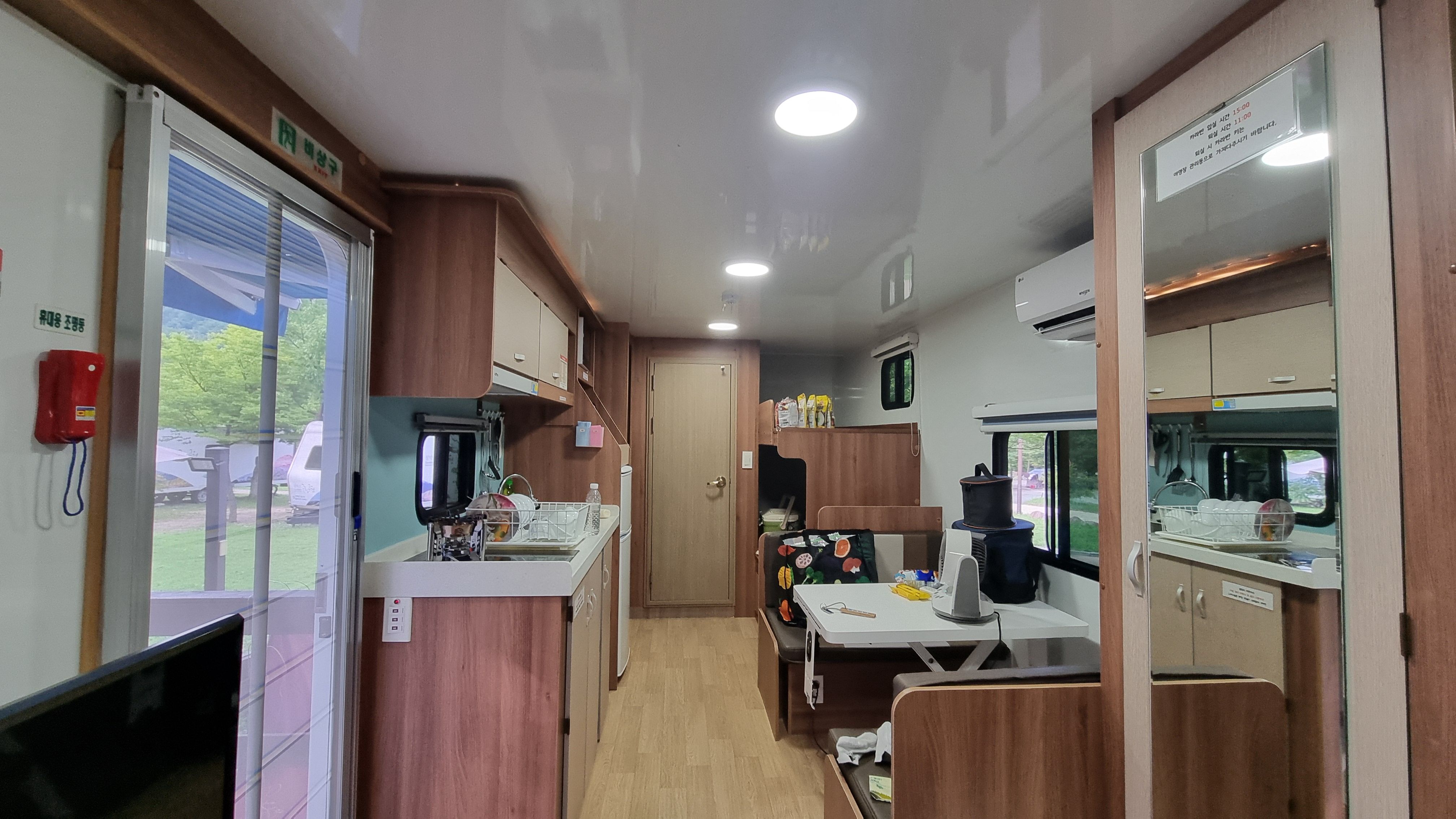 카라반 전면과 측면에 창이 있어 낮에는 실내가 환하고 개방감이 좋았습니다.