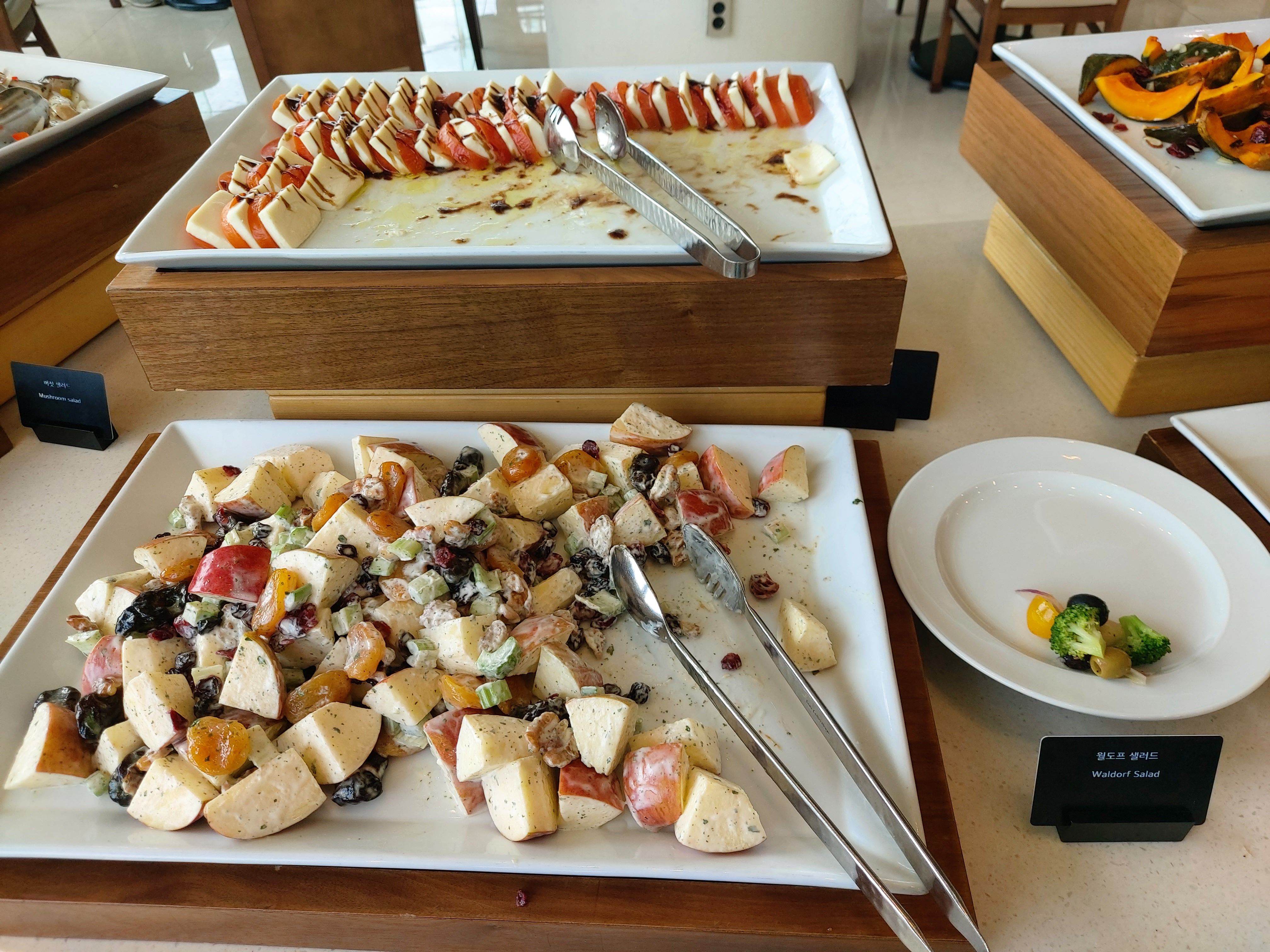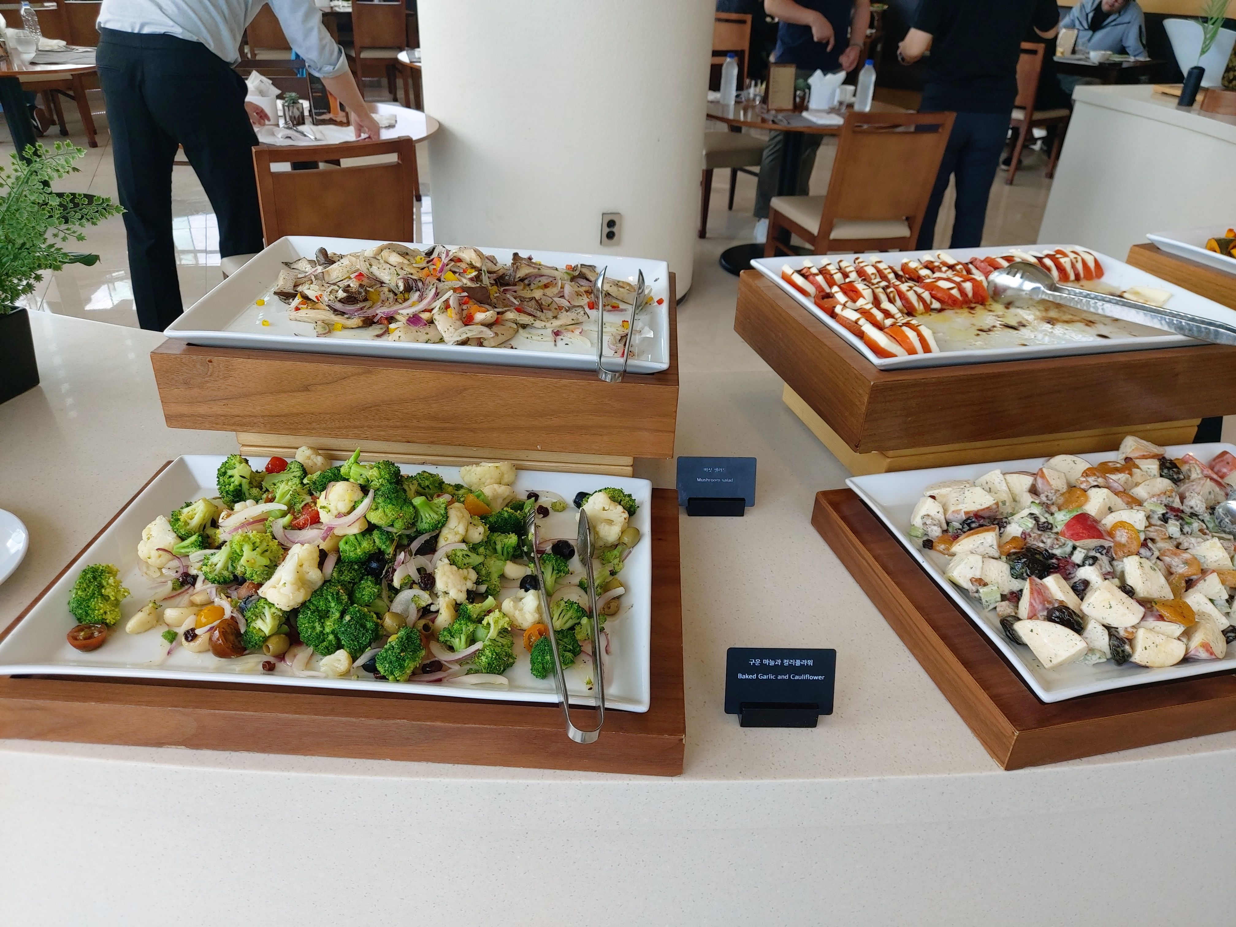 뷔페는 전체적으로 한식, 양식, 샐러드, 과일, 음료 섹션으로 구성되어 있습니다.