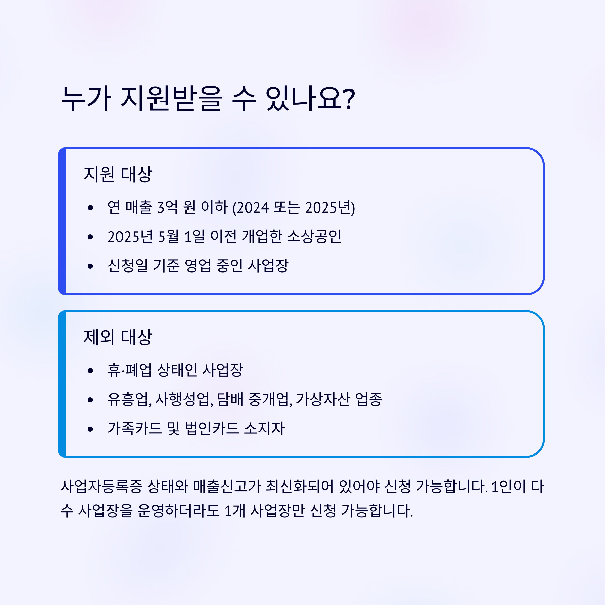 | 지원대상 | 연 매출 3억 원 이하 (2024 또는 2025년) |