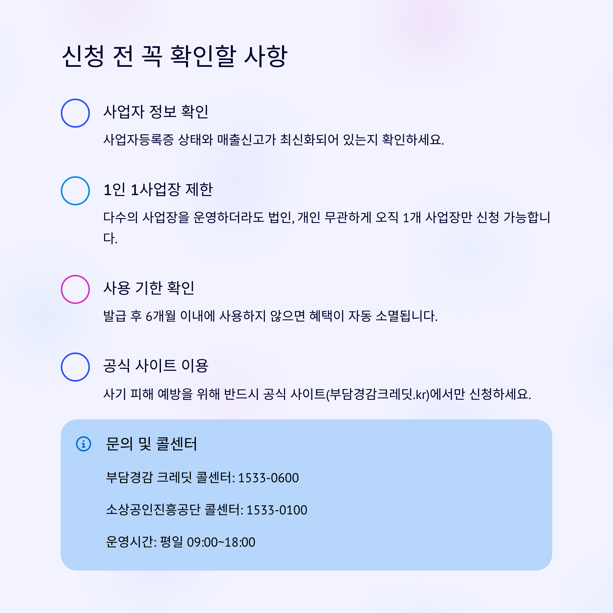 | 신청방법 | 부담경감크레딧.kr / 소상공인24에서 온라인 신청 |