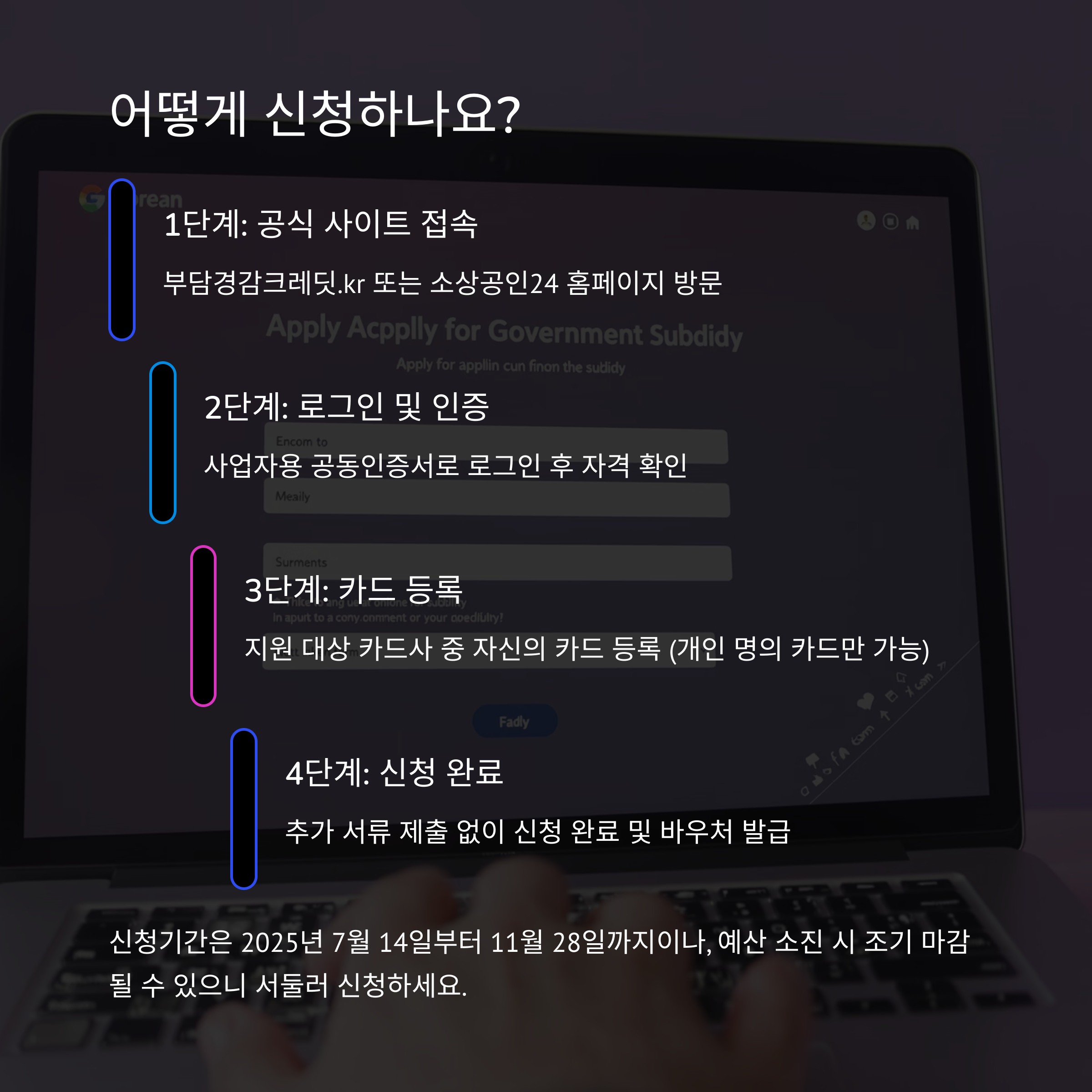 어제(7.14일)부터 접수를 시작한 소상공인 부담경감 크레딧은 중소벤처기업부와 소상공인시장진흥공단이 2025년부터 시행하는 소상공인 고정비용 절감 정책입니다.
