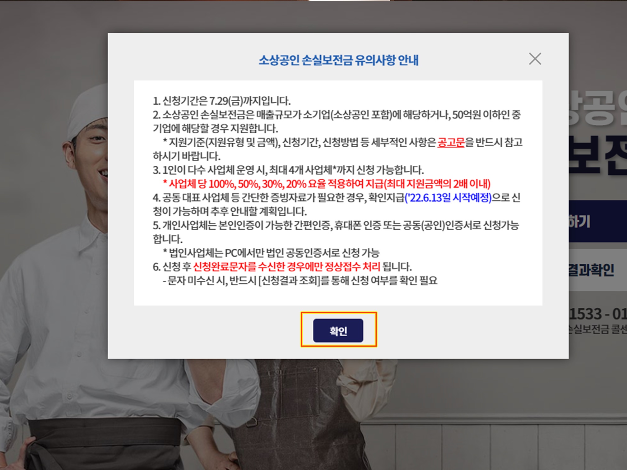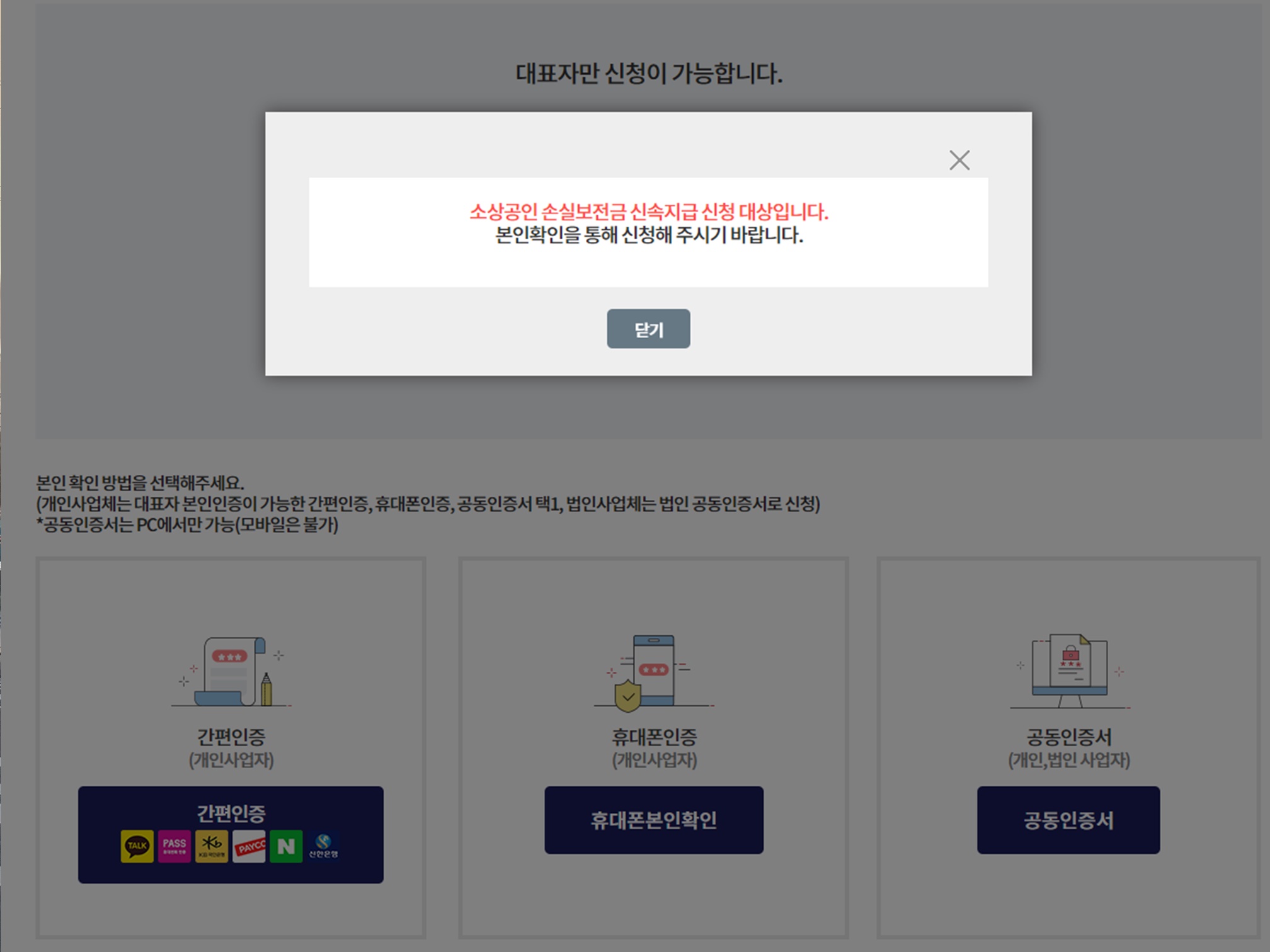 법인사업자손실보전금 신청시에는 pc에서만 가능하고 인증시 위와같이 소상공인 신청대상임을 확인시켜주는 팝업이 뜨게되죠.