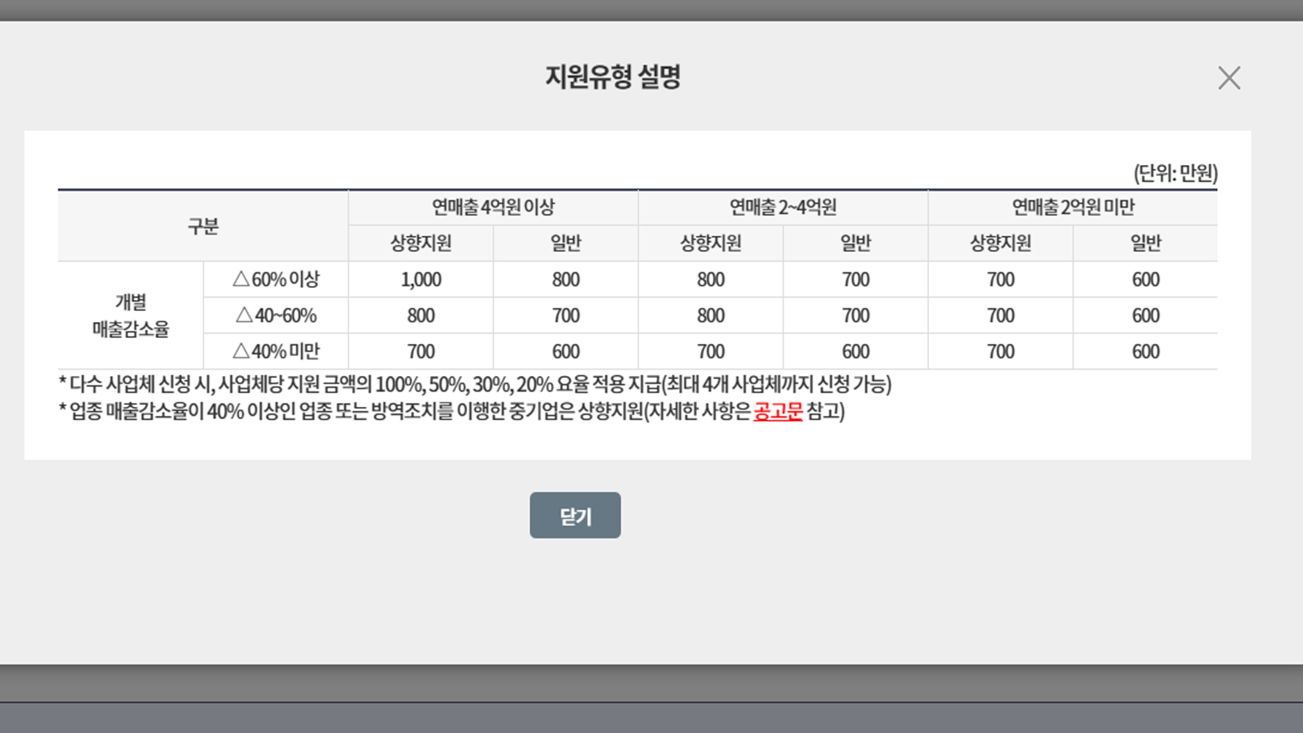 일반사업자는 코로나19방역기간중에 매출액이 감소한 사업체이며, 상향지원사업자란 업종매출감소율이 40%이상인경우로 방역조치를 이행한경우, 그리고 중기업인 경우에만 해당이 됩니다.