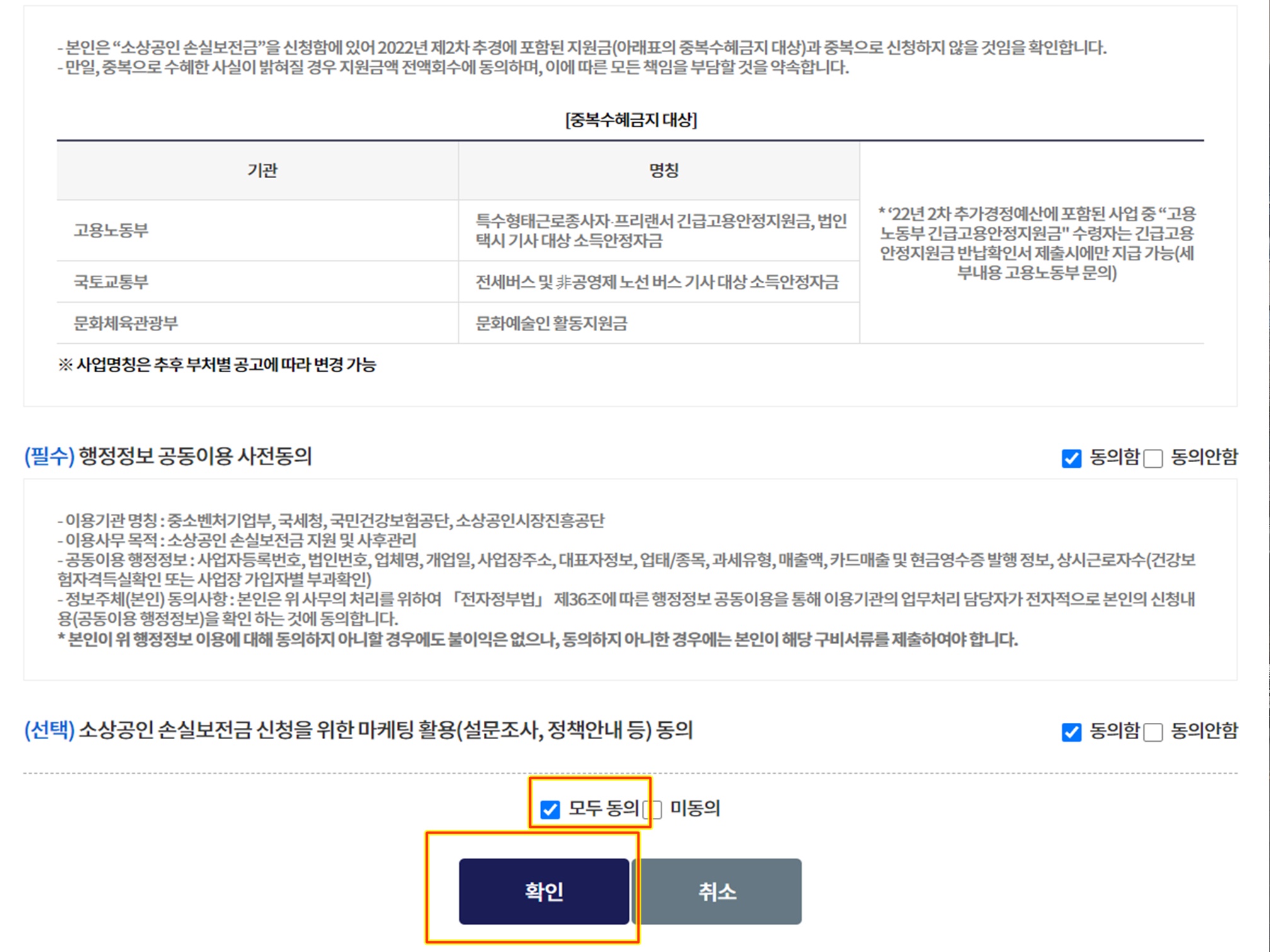 하나하나 동의함을 읽어볼 필요는없고 스크롤을 맨 하단으로 내리면 '모두동의' 버튼이 있으니 이곳에 체크를 누르고 확인을 누르면 법인소상공인손실보전금 입력절차가 간단하게 끝나게됩니다.