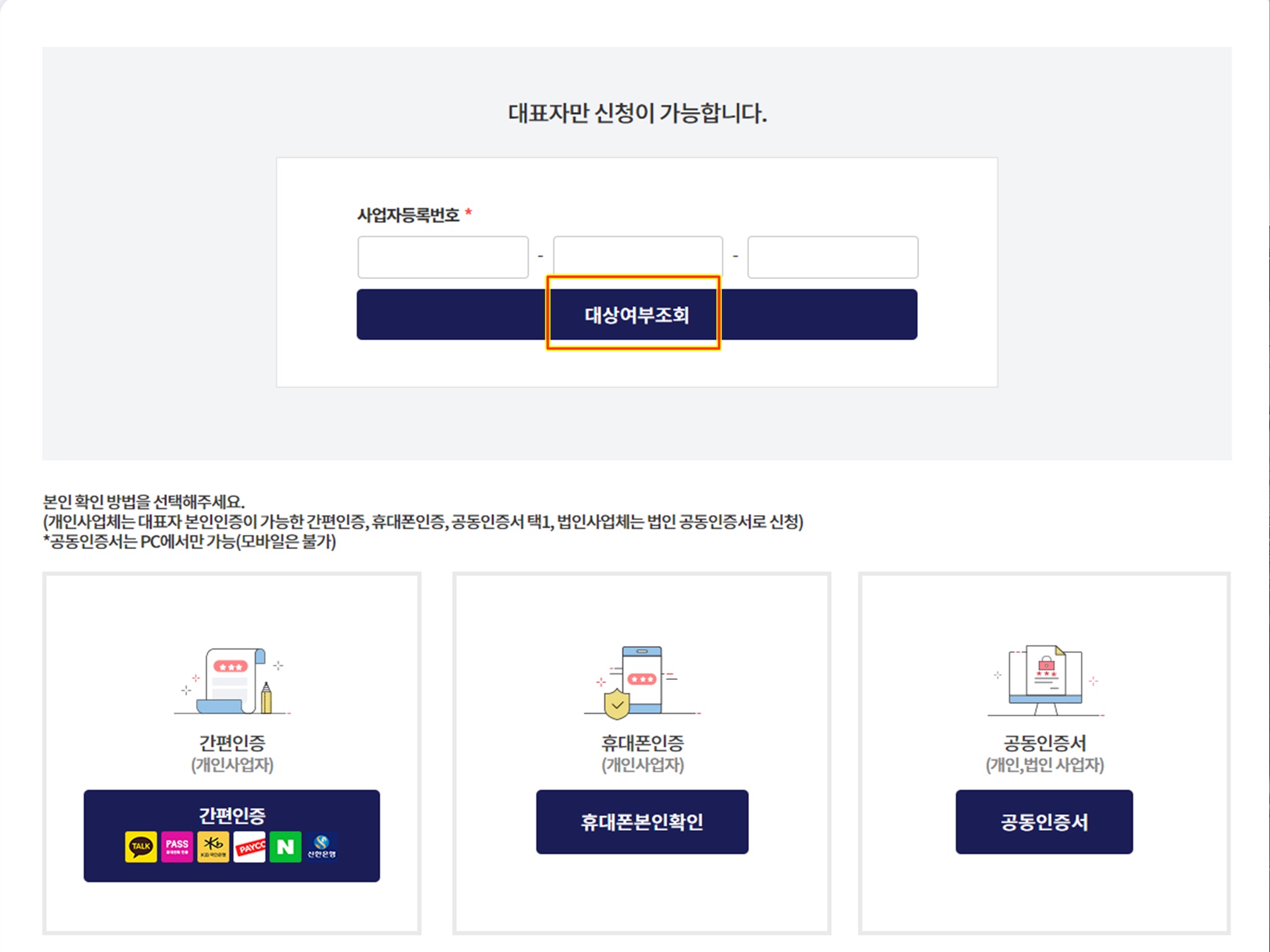 내가 운영하는 법인기업이 손실보전금 지원대상이 되는지 확인하기위해서는 법인공동인증서가 필요하고 대상여부조회를 누르세요.