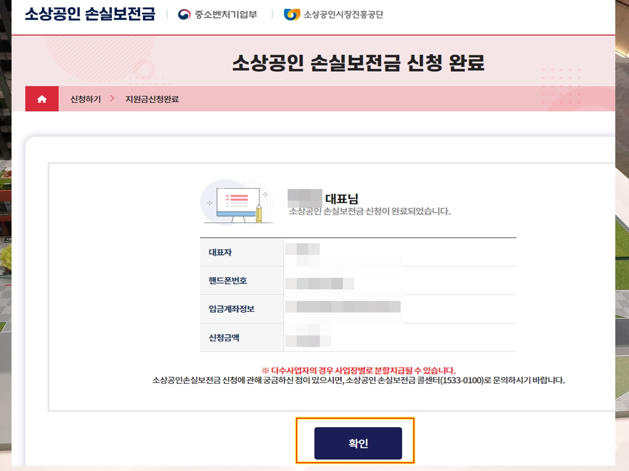 화면과 같이 '000대표님 소상공인 손실보전금 신청이 완료되었습니다' 라고 나오면 신청이 끝나고 약 2시간안에 보전금이 입금되더라구요.