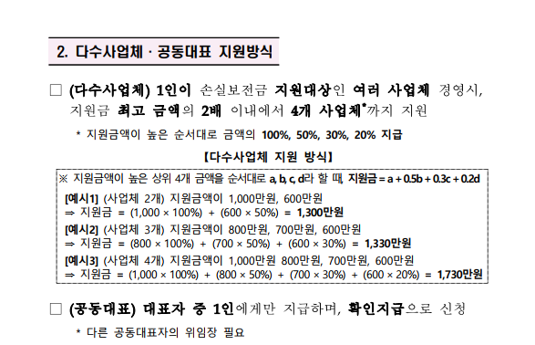 개인사업자뿐만 아니라 소상공인에 해당하는 법인기업들도 손실보전금 신청이 가능한데요 다수사업체를 운영하고있는 대표자들도 중복으로 신처이 가능합니다. 여러사업체 경영시 최고금액의2배까지 4개사업체까지 지원이 가능하니 상당수 대표자들이 개인사업자와 법인사업자를 보유하고 있기도 한데 요건만 맞으면 모두 신청이 가능하답니다.