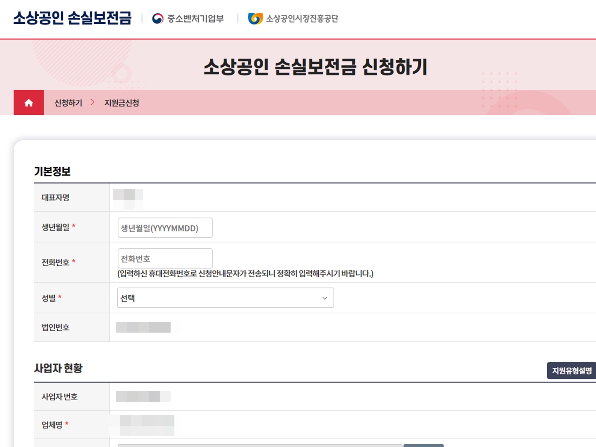 신청하기 버튼을 누르고 들어가면 인적사항을 입력하게 되어있습니다. 개인사업자의 경우 사업자를 입력하면 자동으로 인적사항들이 입력되지만 법인사업자 신청시에는 대표자 생년월일과 전화번호, 성별등은 입력을 해야해요.
