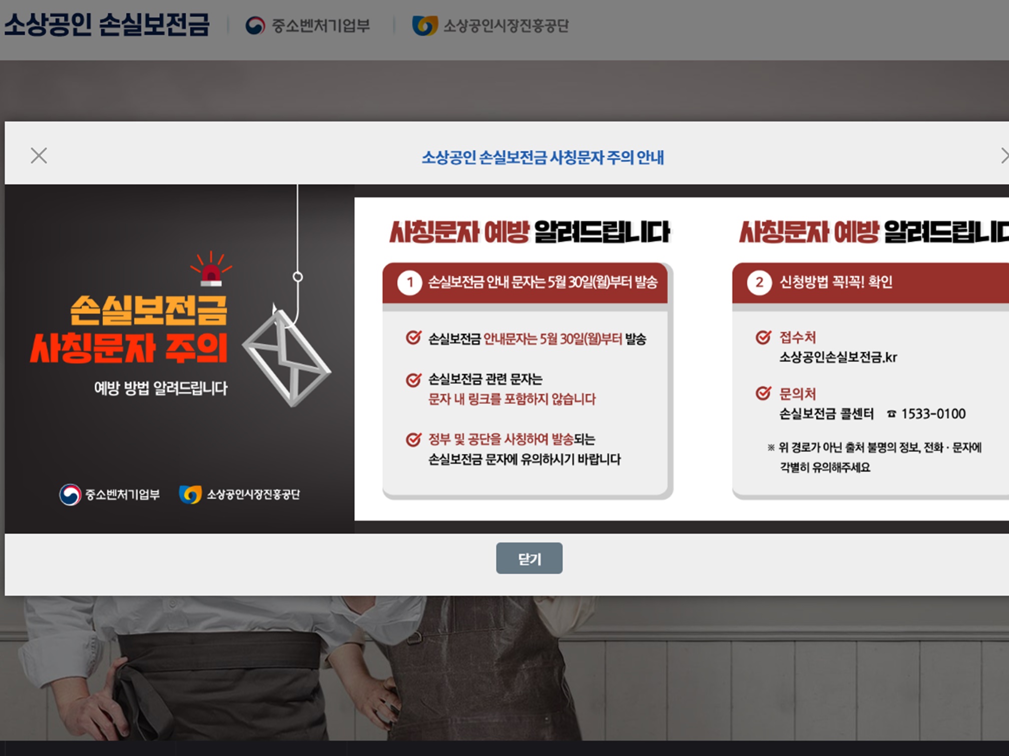 소상공인 손실보전금 사이트에 접속하면 먼저 팝업창이 뜨는데요, 많은분들이 문자로 통보가 오면 신청을 하겠다고 기다리는분들이 있는데 이때를 노리고 사칭문자를 보내는 악질들이 있으니 주의하셔야 하며, 만약 부모님이나 주변에 연세가 있으셔서 인터넷이 서툰분들은 미리 이사실을 알려드리고 대신해서 신청해주면 좋겠네요.