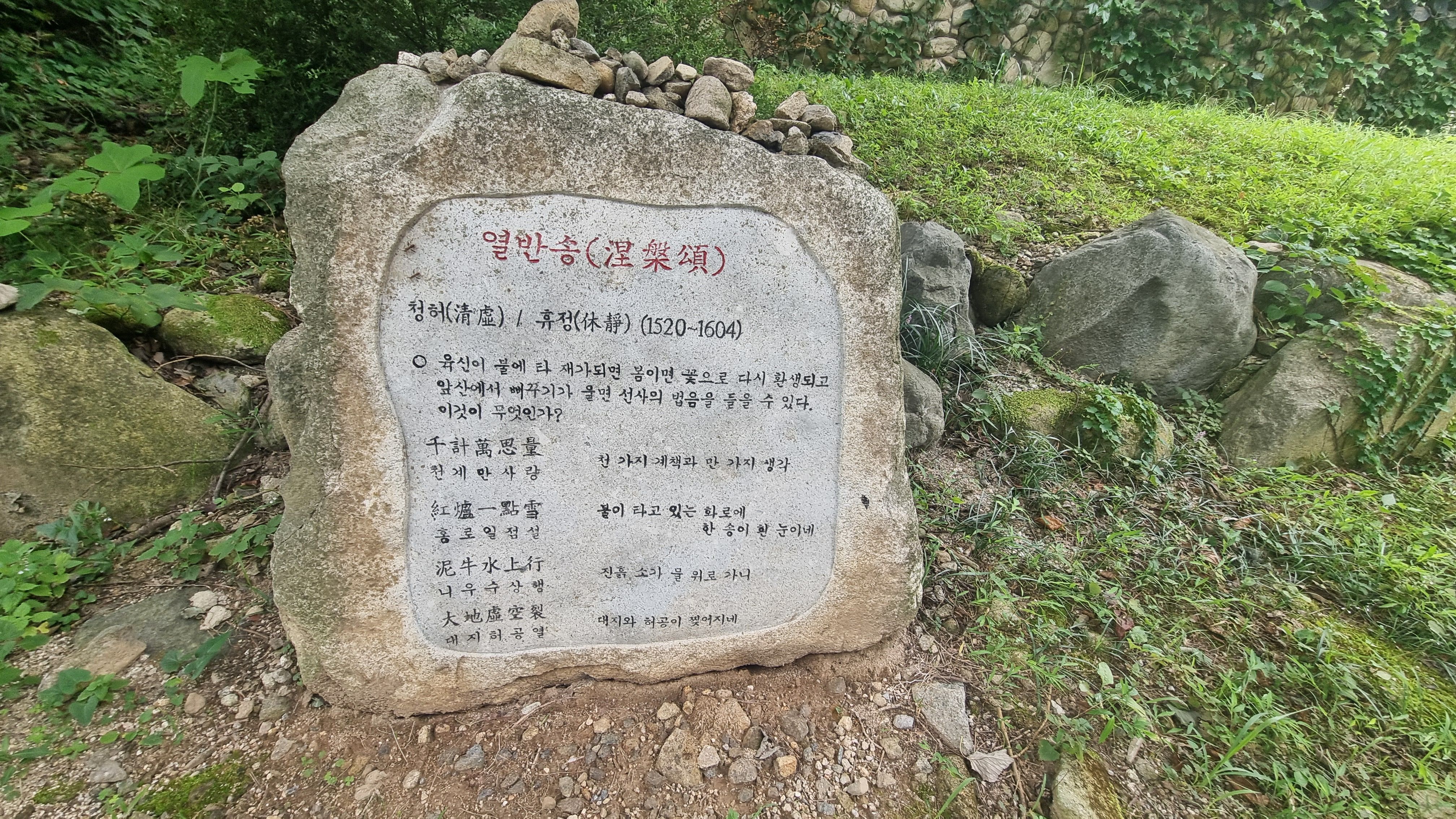 30분이상 걸어야 하는길인데요, 가다보면 숲도 있고 하지만 상당히 가파른길도 있어요. 그런데 가는길에 사진처럼 유명한 스님들의 열반송이나 게송이 적혀있는 바위들이 있는데 그분들은 높은뜻을 알 수는 없으나 읽어보는 재미도 쏠쏠하니 힘들게 오르지 마시고 천천히 걸어으면서 스님들의 마지막 말씀도 한번 생각해 보세요