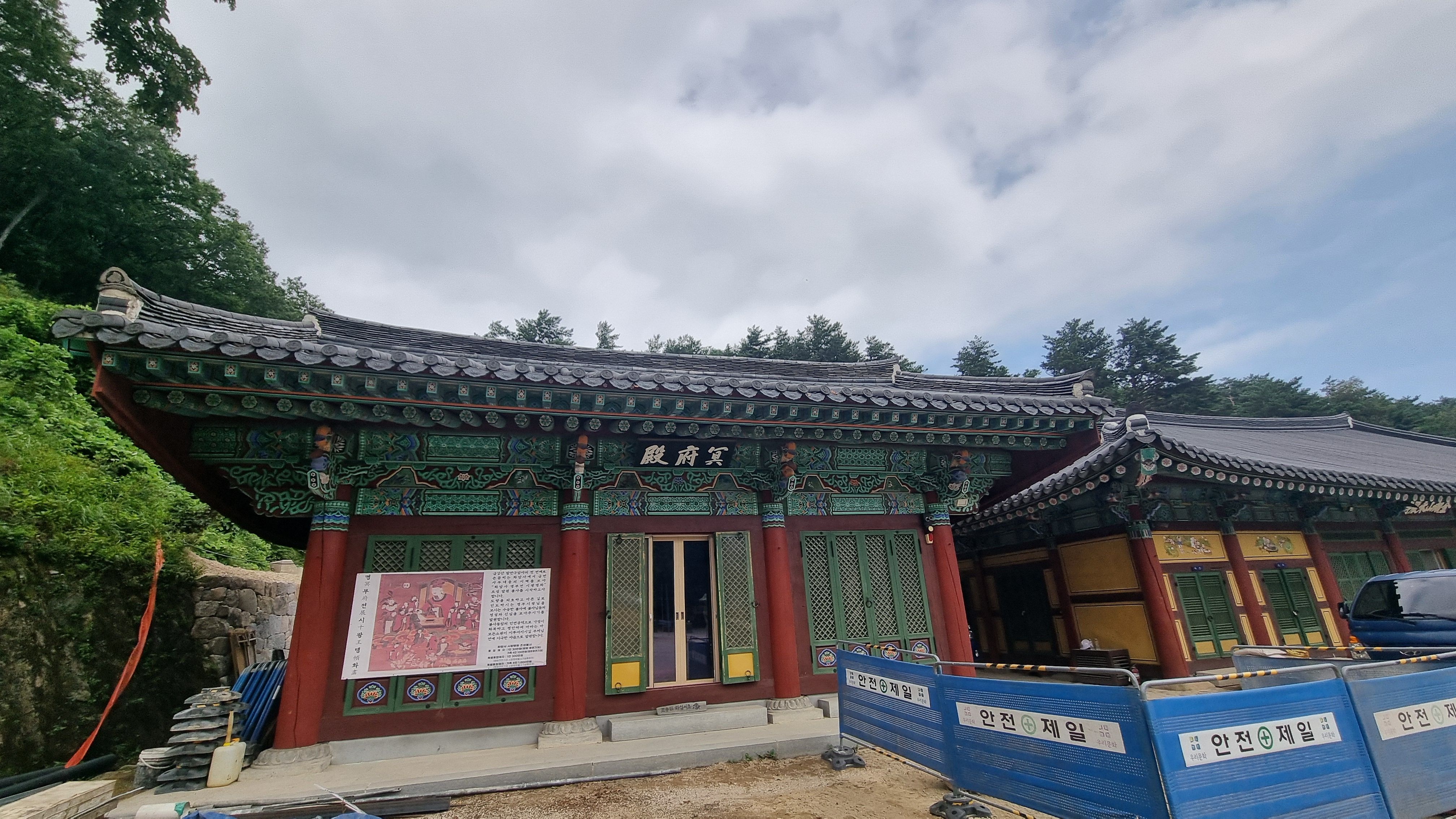 다리를 건너니 공사중인 전각 두어채만 보이고위쪽으로 사물을 보관하는 범종루만 보일뿐 사찰 규모가 생각보다 작습니다.