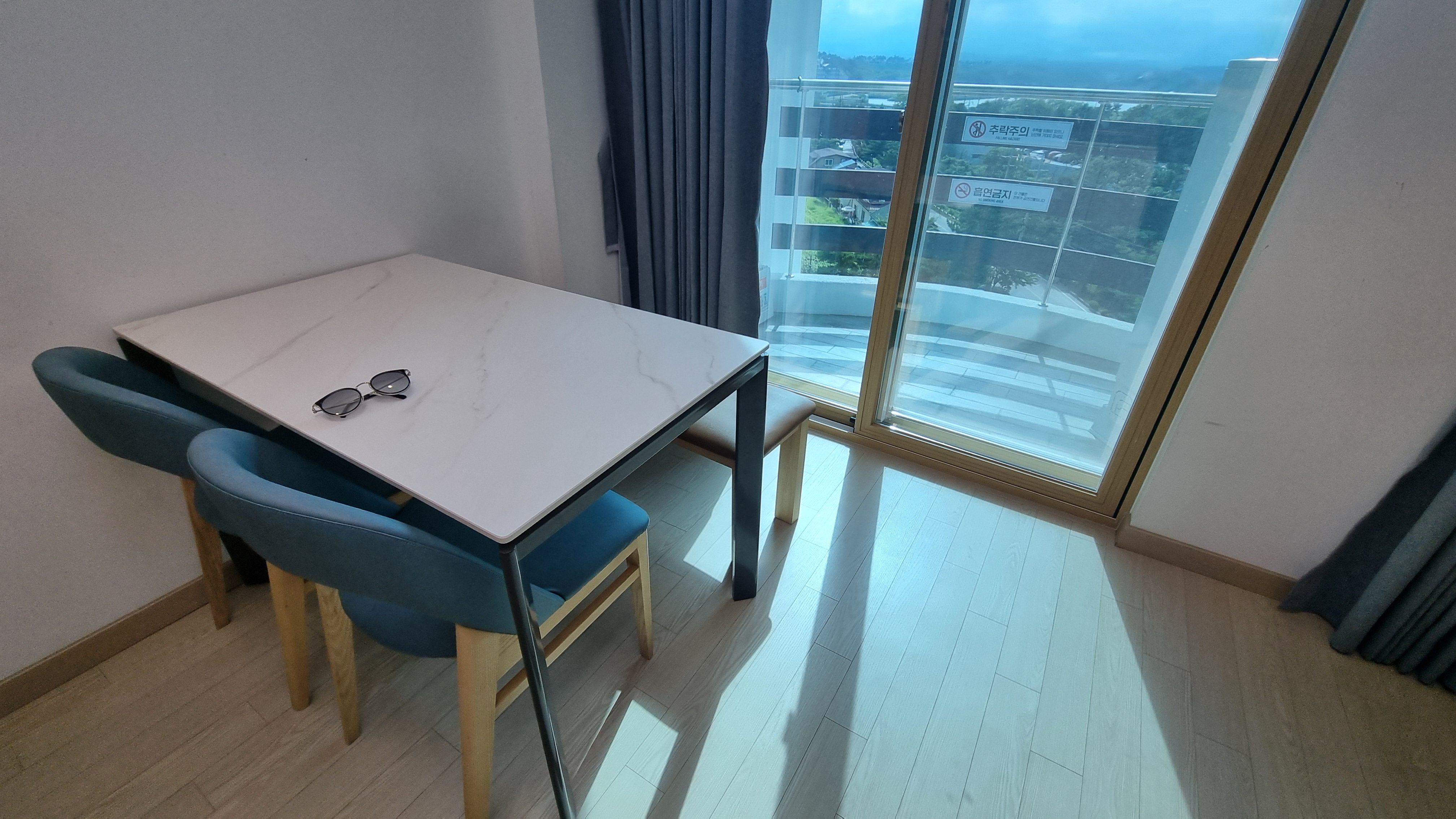 4인용 식탁과 아담한티비가 있어요. 살짝 불편했던거는 티비를 정면으로 볼수없고 식탁에 앉아봐야 한다는건데 창쪽의자가 등받이가 없어서 장시간 시청에 불편함은 있어요.