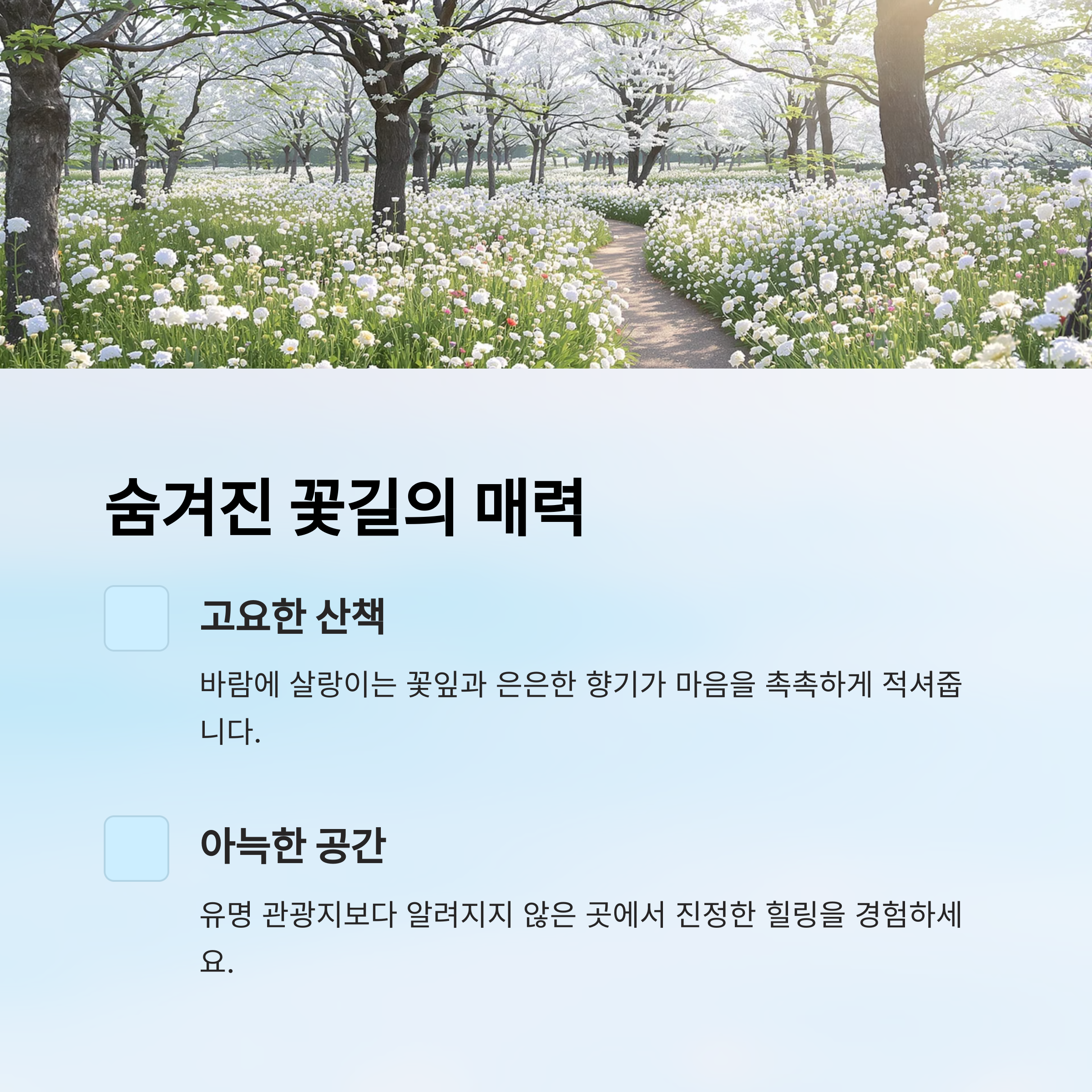 많은 사람들이 몰리는 유명한 장소 말고, 조금은 알려지지 않은 숨은 꽃길들을 소개할게요. 직접 가보면 그 고요함과 아늑함에 반할 거예요.