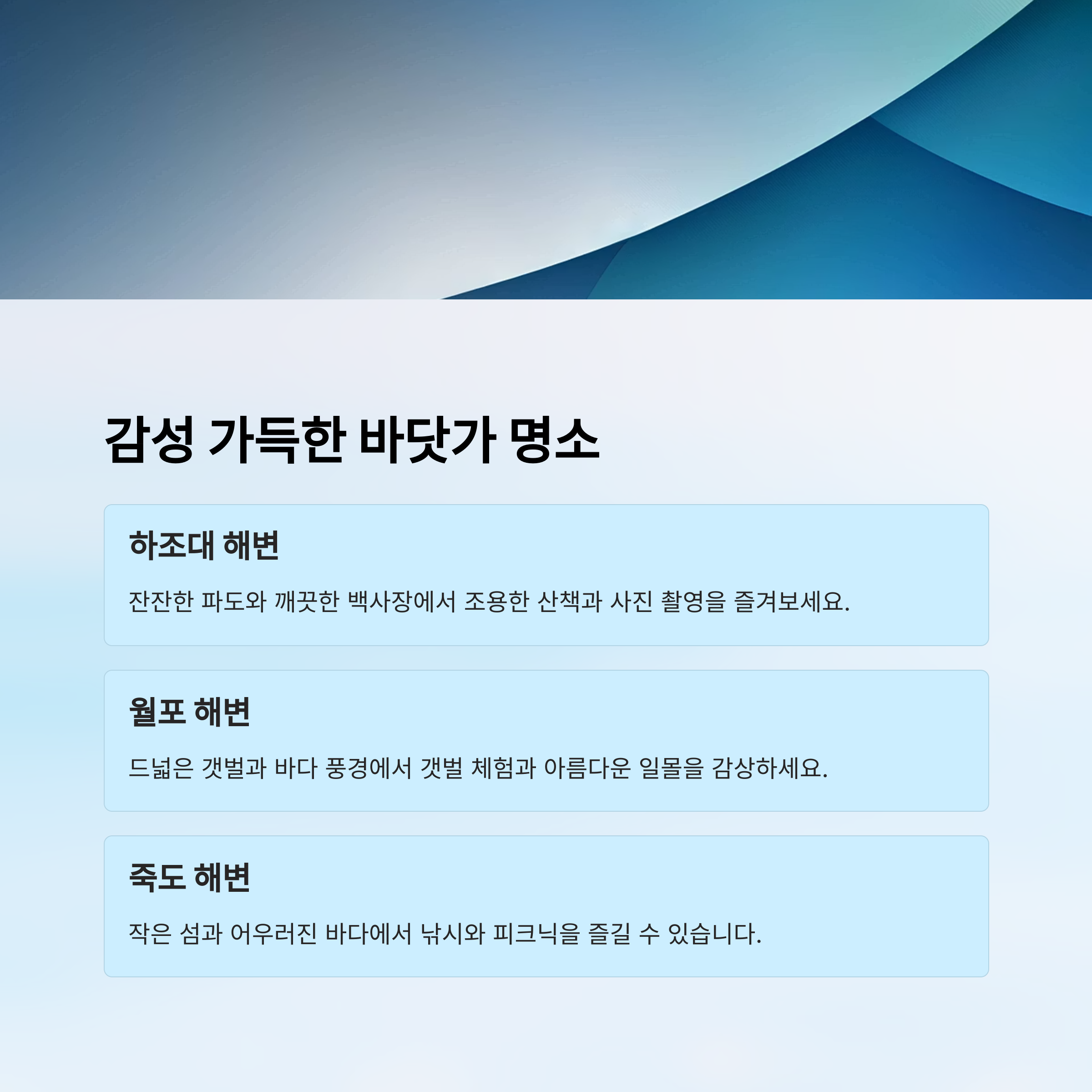 | 여름 (6~8월) | 야생화와 해변 식물이 활발함 | 무더위, 바닷물 온도 최고조 | 모자, 수영복, 자외선 차단제 |