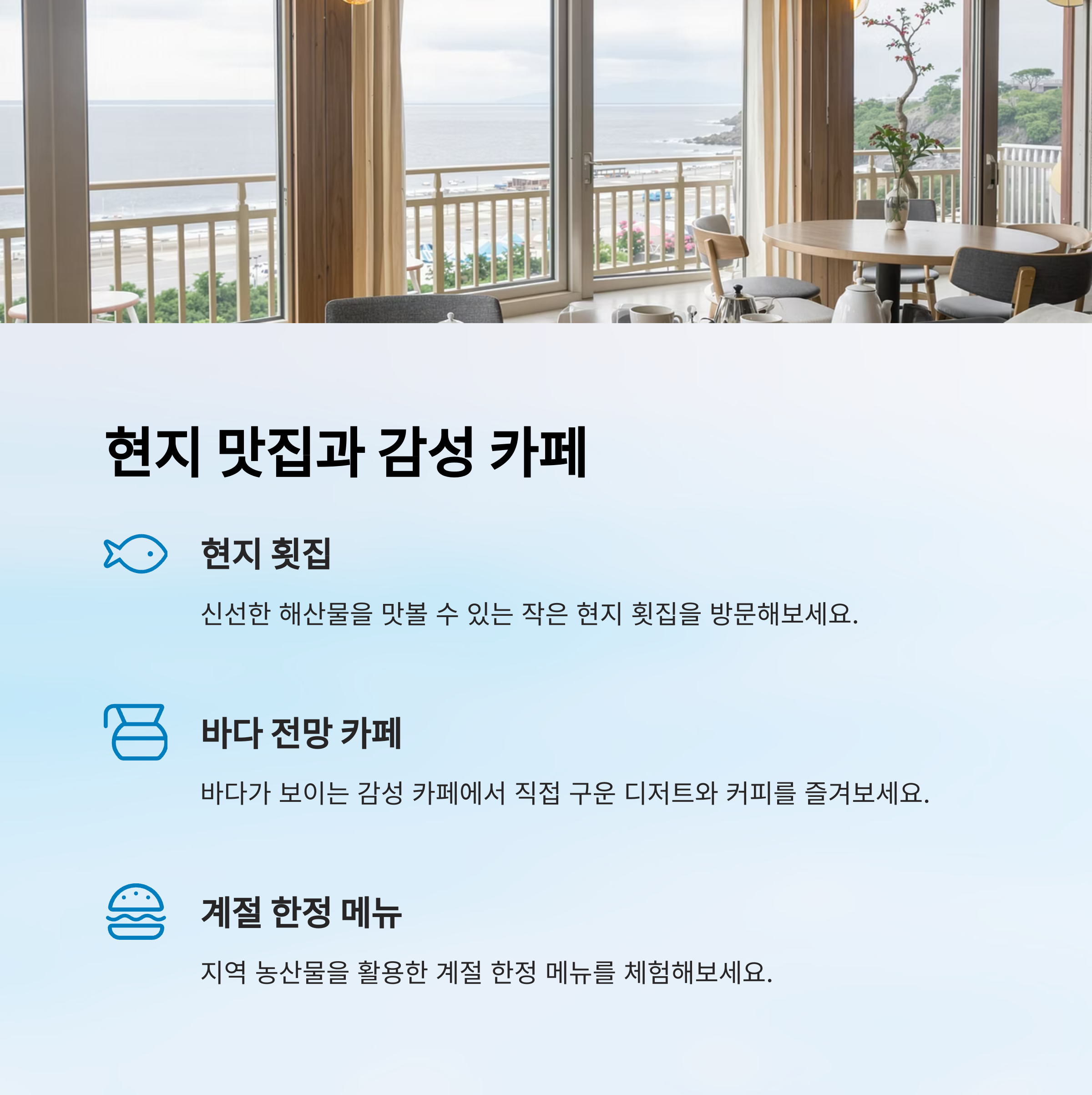 여행의 또 다른 묘미는 바로 현지 맛집 탐방이죠. 꽃길과 바다를 즐긴 후, 지역의 특별한 음식과 분위기 좋은 카페에서 휴식을 취해보세요.