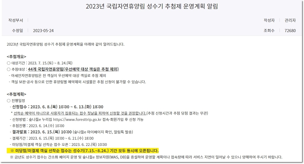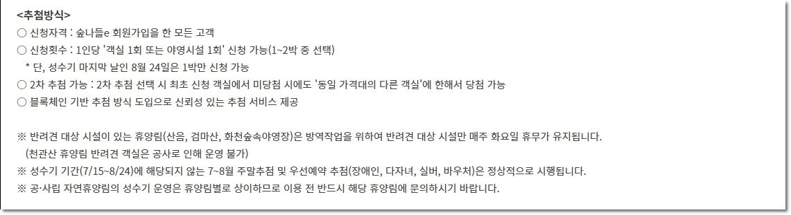 이번 여름 휴가 숙박장소 휴양림으로 정하신분들은 늦지않게  숲나들e  방문하셔서 예약신청하시고 모두 행운을 빕니다. 물론 저도 꼭 당첨되길 바라구요~~