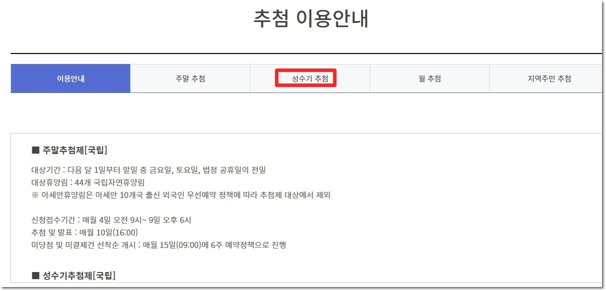 숲나들e 예약방법 입니다. 추첨이용안내 화면에서 성수기추첨을 누립니다.