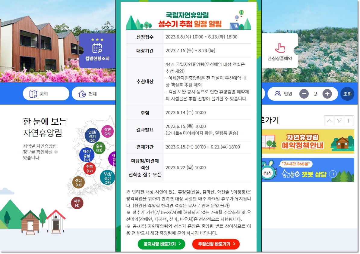이번에 추첨대상은 전국의 국립자연휴양림 44개곳으로 결과발표가 6.15(목) 10시에 되면 당첨여부가 문자로 통보되고 사이트에 들어가서 추첨신청내역을 확인하면 당첨여부를 확인 할 수가 있죠.