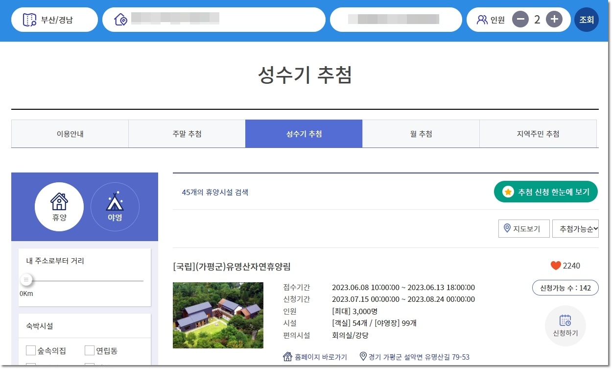 성수기 추첨하면의 첫화면이구요. 여기 화면에서 지역, 휴양림이름, 예약기간을 선택하고 조회를 누르면되는데요, 인원은 굳이 선택안해도 상관없어요.